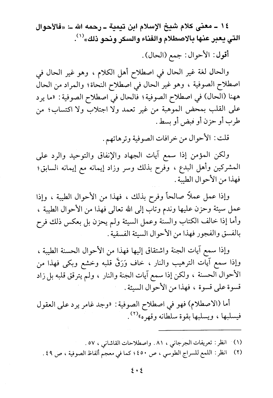 14 ـ معنى كلام شيخ الإسلام ابن تيمية ـ رحمه الله ـ "فالأحوال التي يعبر عنها بالاصطلام والفناء والسكر ونحو ذلك"1.