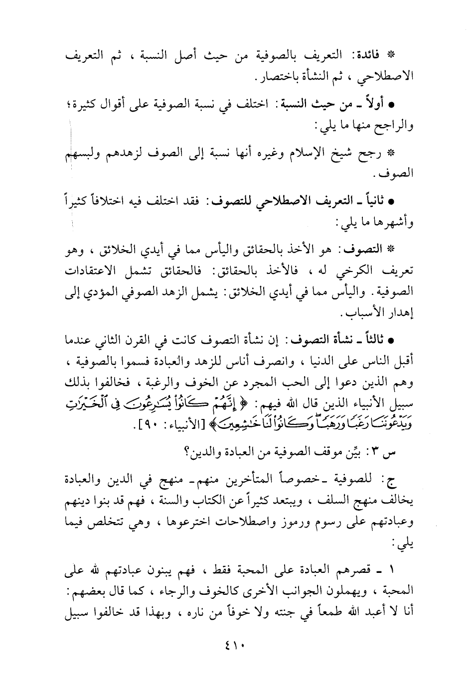 * فائدة: التعريف بالصوفية من حيث أصل النسبة، ثم التعريف الاصطلاحي، ثم النشأة باختصار.