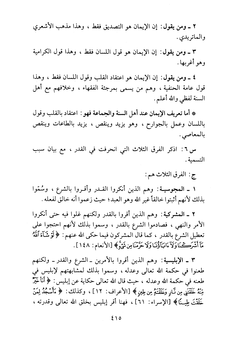 4ـ ومن يقول: إن الإيمان هو اعتقاد القلب وقول السان فقط، وهذا قول عامة الحنفية، وهم من يسمى بمرجئة الفقهاء، وخلافهم مع أهل السنة لفظي والله أعلم.
