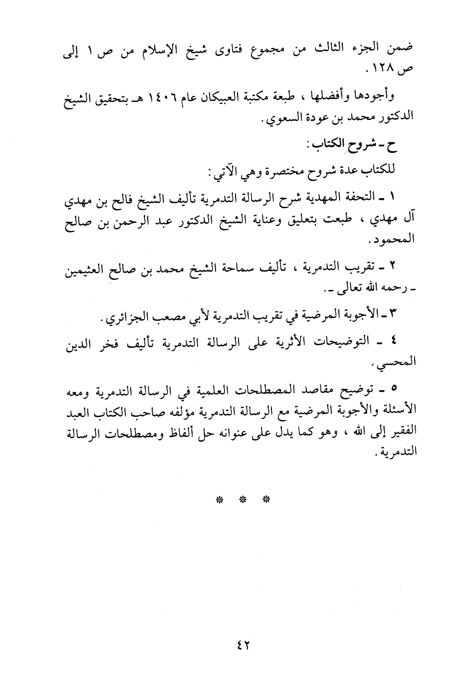 1 ـ التحفة المهدية شرح الرسالة التدمرية تأليف الشيخ فالح بن مهدي آل مهدي، طبعت بتعليق وعناية الشيخ الدكتور عبد الرحمن بن صالح المحمود.