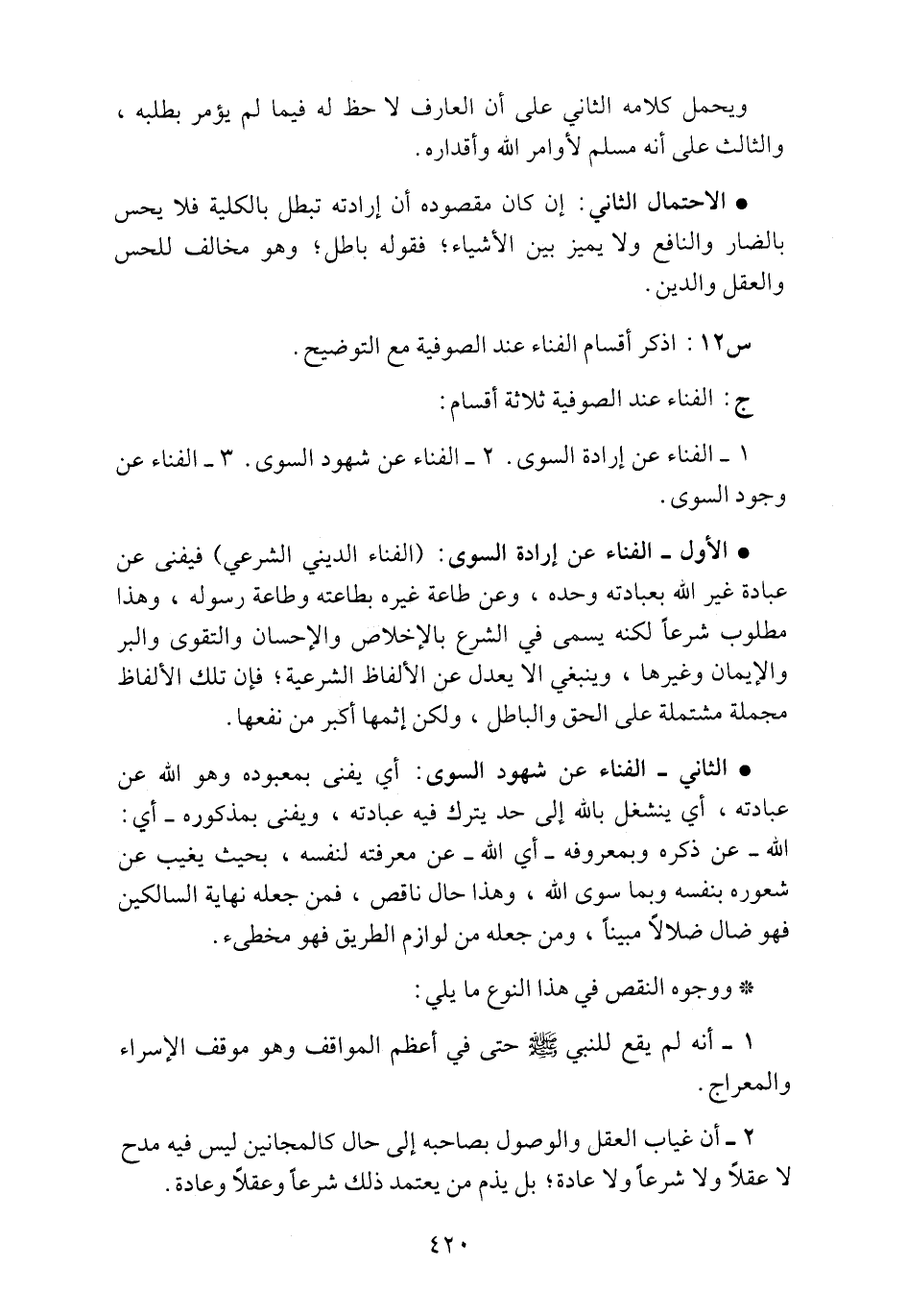 • الأول ـ الفناء عن إرادة السوى: (الفناء الديني الشرعي) فيفنى عن عبادة غير الله بعبادته وحده، وعن طاعة غيره بطاعته وطاعة رسوله، وهذا مطلوب شرعاً لكنه يسمى في الشرع بالإخلاص والإحسان والتقوى والبر والإيمان وغيرها، وينبغي ألا يعدل عن الألفاظ الشرعية؛ فإن تلك الألفاظ مجملة مشتملة على الحق والباطل، ولكن إثمها أكبر من نفعها.