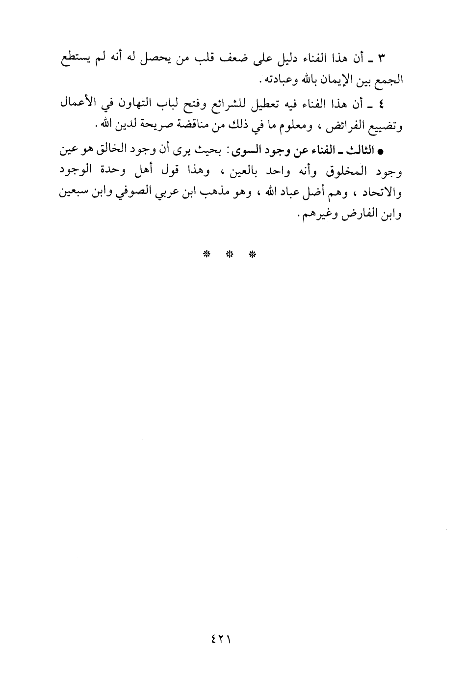 • الثالث ـ الفناء عن وجود السوى: بحيث يرى أن وجود الخالق هو عين وجود المخلوق وأنه واحد بالعين، وهذا قول وحدة الوجود والاتحاد، وهم أضل عباد الله، وهو مذهب ابن عربي الصوفي وابن سبعين وابن الفارض وغيرهم.