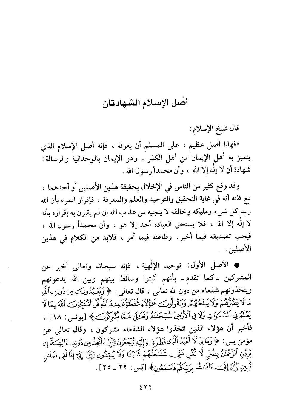 "فهذا أصل عظيم، على المسلم أن يعرفه، فإنه أصل الإسلام الذي يتميز به أهل الإيمان من أهل الكفر، وهو الإيمان بالوحدانية والرسالة: شهادة أن لا إله إلا الله، وأن محمَّداً رسول الله.