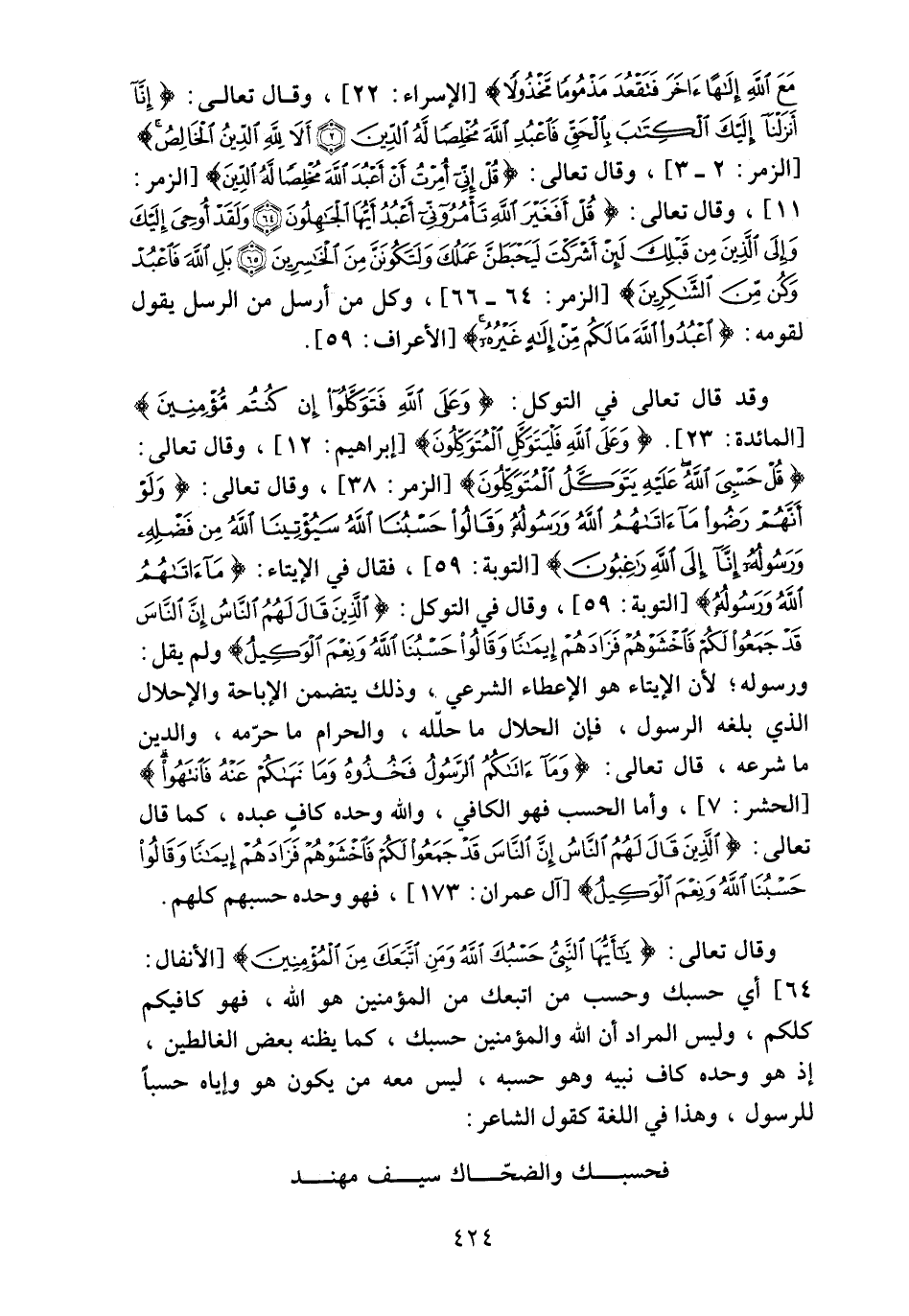 وقد قال تعالى في التوكل: {وَعَلَى اللَّهِ فَتَوَكَّلُوا إِنْ كُنْتُمْ مُؤْمِنِينَ} [المائدة: 23] .، {وَعَلَى اللَّهِ فَلْيَتَوَكَّلِ الْمُتَوَكِّلُونَ} [إبراهيم: 12] ، وقال تعالى: {قُلْ حَسْبِيَ اللَّهُ عَلَيْهِ يَتَوَكَّلُ الْمُتَوَكِّلُونَ} [الزمر: 38] ، وقال تعالى: {وَلَوْ آنَّهُمْ رَضُوا مَا آتَاهُمُ اللَّهُ وَرَسُولُهُ وَقَالُوا حَسْبُنَا اللَّهُ سَيُؤْتِينَا اللَّهُ مِنْ فَضْلِهِ وَرَسُولُهُ إِنَّا إِلَى اللَّهِ رَاغِبُونَ} [التوبة: 59] ، فقال في الإيتاء: {مَا آتَاهُمُ اللَّهُ وَرَسُولُهُ} [التوبة: 59] ، وقال في التوكل: {الَّذِينَ قَالَ لَهُمُ النَّاسُ إِنَّ النَّاسَ قَدْ جَمَعُوا لَكُمْ فَاخْشَوْهُمْ فَزَادَهُمْ إِيمَانًا وَقَالُوا حَسْبُنَا اللَّهُ وَنِعْمَ الْوَكِيلُ} ولم يقل: ورسوله؛ لأن الإيتاء هو الإعطاء الشرعي، وذلك يتضمن الإباحة والإحلال الذي بلغه الرسول، فإن الحلال ما حلله، والحرام ما حرّمه، والدين ما شرعه، قال تعالى: {وَمَا آتَاكُمُ الرَّسُولُ فَخُذُوهُ وَمَا نَهَاكُمْ عَنْهُ فَانْتَهُوا} [الحشر: 7] ، وأما الحسب فهو الكافي، والله وحده كافٍ عبده، كما قال تعالى: {الَّذِينَ قَالَ لَهُمُ النَّاسُ إِنَّ النَّاسَ قَدْ جَمَعُوا لَكُمْ فَاخْشَوْهُمْ فَزَادَهُمْ إِيمَانًا وَقَالُوا حَسْبُنَا اللَّهُ وَنِعْمَ الْوَكِيلُ} [آل عمران: 173] ، فهو وحده حسبهم كلهم.