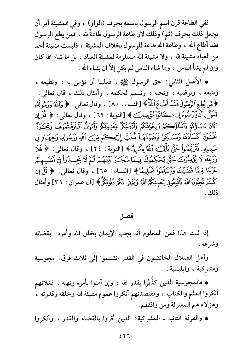• الأصل الثاني: حق الرسول صلى الله عليه وسلم، فعلينا أن نؤمن به، ونطيعه، ونتبعه، ونرضيه، ونحبه، ونسلم لحكمه، وأمثال ذلك، قال تعالى: {مَنْ يُطِعِ الرَّسُولَ فَقَدْ أطَاعَ اللَّهَ} [النساء: 80] ، وقال تعالى: {وَاللَّهُ وَرَسُولُهُ أحَقُّ أنْ يُرْضُوهُ إِنْ كَانُوا مُؤْمِنِينَ} [التوبة: 62] ، وقال تعالى: {قُلْ إِنْ كَانَ آبَاؤُكُمْ وَأبْنَاؤُكُمْ وَإِخْوَانُكُمْ وَأزْوَاجُكُمْ وَعَشِيرَتُكُمْ وَأمْوَالٌ اقْتَرَفْتُمُوهَا وَتِجَارَةٌ تَخْشَوْنَ كَسَادَهَا وَمَسَاكِنُ تَرْضَوْنَهَا أحَبَّ إِلَيْكُمْ مِنَ اللَّهِ وَرَسُولِهِ وَجِهَادٍ فِي سَبِيلِهِ فَتَرَبَّصُوا حَتَّى يَأْتِيَ اللَّهُ بِأمْرِهِ} [التوبة: 24] ، وقال تعالى: {فَلا وَرَبِّكَ لا يُؤْمِنُونَ حَتَّى يُحَكِّمُوكَ فِيمَا شَجَرَ بَيْنَهُمْ ثُمَّ لا يَجِدُوا فِي آنْفُسِهِمْ حَرَجًا مِمَّا قَضَيْتَ وَيُسَلِّمُوا تَسْلِيمًا} [النساء: 65] ، وقال تعالى: {قُلْ إِنْ كُنْتُمْ تُحِبُّونَ اللَّهَ فَاتَّبِعُونِي يُحْبِبْكُمُ اللَّهُ وَيَغْفِرْ لَكُمْ ذُنُوبَكُمْ} [آل عمران: 31] وأمثال ذلك.