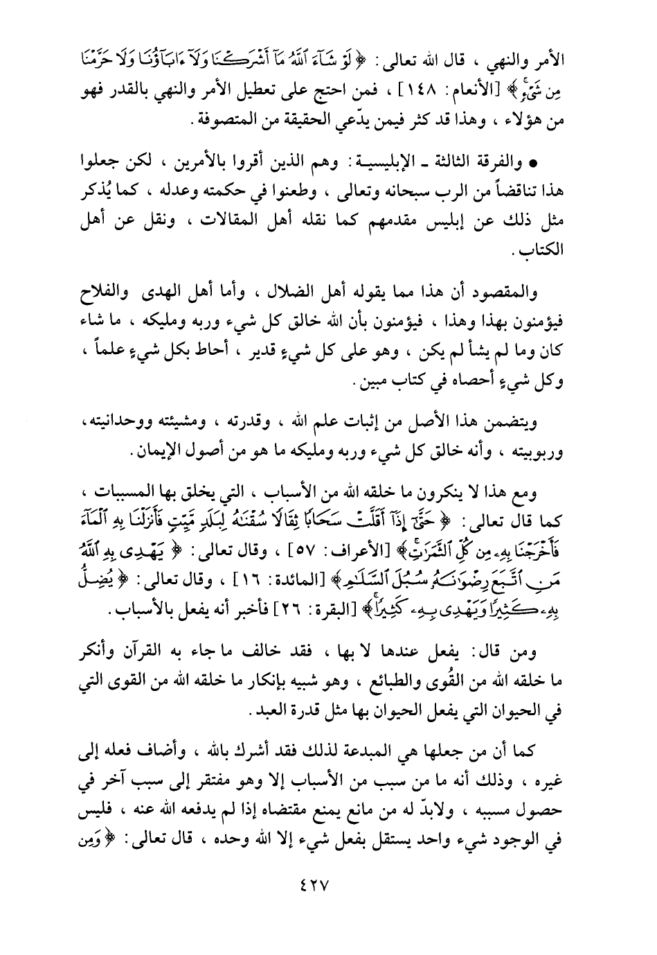 والمقصود أن هذا مما يقوله أهل الضلال، وأما أهل الهدى والفلاح فيؤمنون بهذا وهذا، فيؤمنون بأن الله خالق كل شيء قدير، أحاط بكل شيء علماً، وكل شيء أحصاه في كتاب مبين.