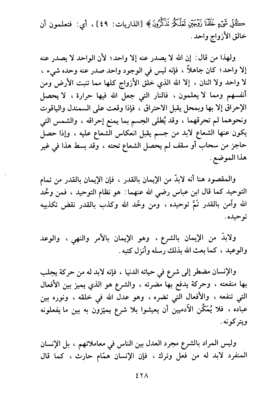 والمقصود هنا أنه لابدّ من الإيمان بالقدر، فإن الأيمان بالقدر من تمام التوحيد كما قال ابن عباس رضي الله عنهما: هو نظام التوحيد، فمن وحَّد الله وآمن بالقدر تَمَّ توحيده، ومن وحَّد الله وكذب بالقدر نقض تكذيبه توحيده.