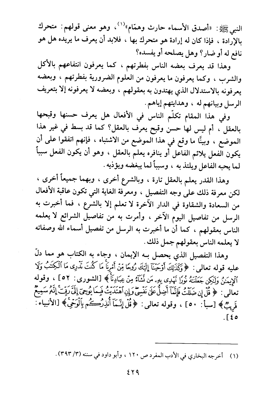 النبي صلى الله عليه وسلم: "أصدق الأسماء حارث وهمّام" 1، وهو معنى قولهم: متحرك بالإرادة، فإذا كان له إرادة هو متحرك بها، فلابد أن يعرف ما يريده هل هو نافع له أو ضار؟ وهل يصلحه أو يفسده؟
