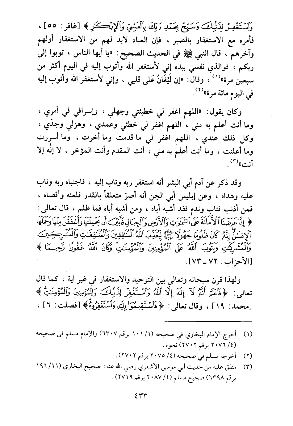 وَاسْتَغْفِرْ لِذَنْبِكَ وَسَبِّحْ بِحَمْدِ رَبِّكَ بِالْعَشِيِّ وَالإِبْكَارِ} [غافر: 55] ، فأمره مع الاستغفار بالصبر، فإن العباد لا بد لهم من الاستغفار أولهم وآخرهم، قال النبي صلى الله عليه وسلم في الحديث الصحيح: "يا أيها الناس، توبوا إلى ربكم، فوالذي نفسي بيده إني لأستغفر الله وأتوب إليه في اليوم أكثر من سبعين مرة" 1.وقال: (إن ليغان على قلبي، وإني لأستغفر الله وأتوب إليه في اليوم مائة مرة)