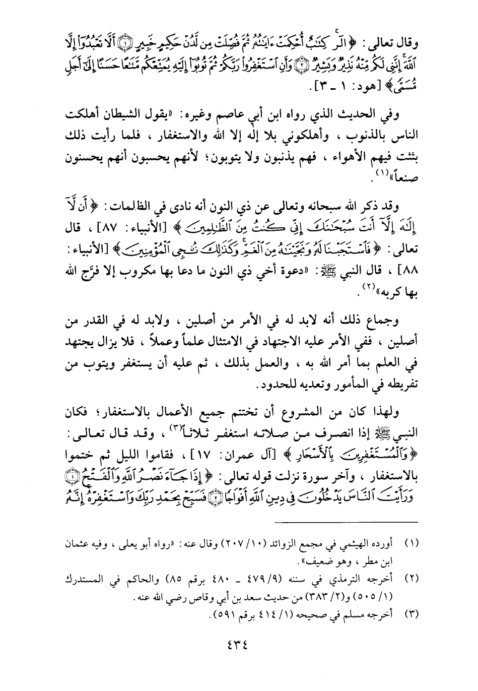 ولهذا كان من المشروع أن تختتم جميع الأعمال بالاستغفار؛ فكان النبي صلى الله عليه وسلم إذا انصرف من صلاته استغفر ثلاثاً3، وقد قال تعالى: {وَالْمُسْتَغْفِرِينَ بِالأسْحَارِ} [آل عمران: 17] ، فقاموا الليل ثم ختموا بالاستغفار، وآخر سورة نزلت في قوله تعالى: {إِذَا جَاءَ نَصْرُ اللَّهِ وَالْفَتْحُ * وَرَأيْتَ النَّاسَ يَدْخُلُونَ فِي دِينِ اللَّهِ أفْوَاجًا * فَسَبِّحْ بِحَمْدِ رَبِّكَ وَاسْتَغْفِرْهُ إِنَّهُ