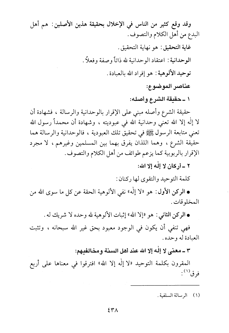 حقيقة الشرع وأصله مبني على الإقرار بالوحدانية والرسالة هما حقيقة الشرع، وهما اللذان يفرق بهما بين المسلمين وغيرهم، لا مجرد الإقرار بالربوبية كما يزعم طوائف من أهل الكلام والتصوف.