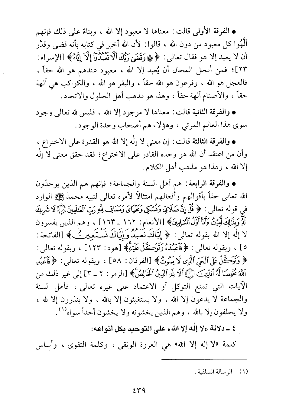 • والفرقة الرابعة: هم أهل السنة والجماعة؛ فإنهم هم الذين يوحّدون الله تعالى حقاً بأقوالهم وأفعالهم امتثالاً لأمره تعالى لنبيه محمد صلى الله عليه وسلم الوارد في قوله تعالى: {قُلْ إِنَّ صَلاتِي وَنُسُكِي وَمَحْيَايَ وَمَمَاتِي لِلَّهِ رَبِّ الْعَالَمِينَ * لا شَرِيكَ لَهُ وَبِذَلِكَ أُمِرْتُ وَأنَا أوَّلُ الْمُسْلِمِينَ} [الأنعام: 162ـ163] ، وهم الذين يفسرون لا إله إلا الله بقوله تعالى: {إِيَّاكَ نَعْبُدُ وَإِيَّاكَ نَسْتَعِينُ} [الفاتحة: 5] ، وبقوله تعالى: {فَاعْبُدْهُ وَتَوَكَّلْ عَلَيْهِ} [هود: 123] ، وبقوله تعالى: {وَتَوَكَّلْ عَلَى الْحَيِّ الَّذِي لا يَمُوتُ} [الفرقان: 58] ، وبقوله تعالى: {فَاعْبُدِ اللَّهَ مُخْلِصًا لَهُ الدِّينَ * ألا لِلَّهِ الدِّينُ الْخَالِصُ} [الزمر: 2ـ3] إلى غير ذلك من الآيات التي تمنع التوكل أو الاعتماد على غيره تعالى، فأهل السنة والجماعة لا يدعون إلا الله، ولا يستغيثون إلا بالله، ولا ينذرون إلا الله، ولا يحلفون إلا بالله، وهم الذين يخشونه ولا يخشون أحداً سواه1.