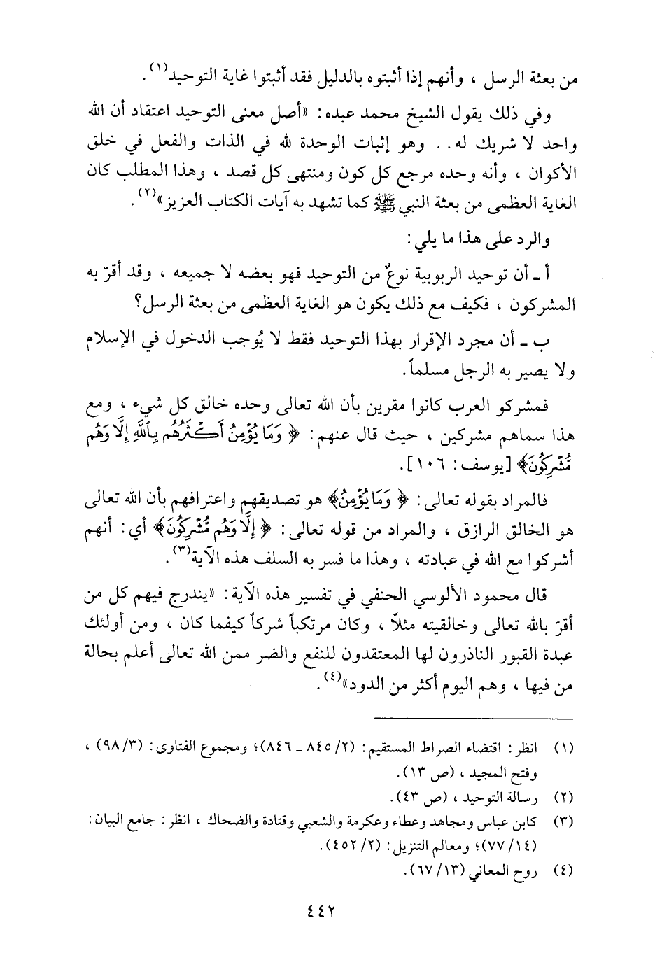 فمشركو العرب كانوا مقرين بأن الله تعالى وحده خالق كل شيء، ومع هذا سماهم مشركين، حيث قال عنهم: {وَمَا يُؤْمِنُ أكْثَرُهُمْ بِاللَّهِ إِلا وَهُمْ مُشْرِكُونَ} [يوسف: 106] .