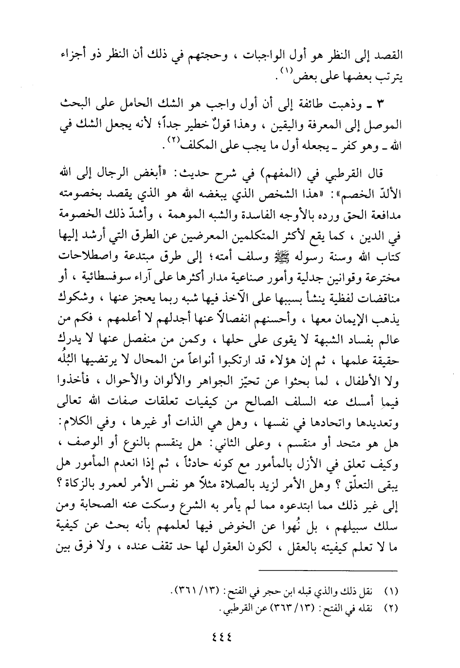 قال القرطبي في (المفهم) في شرح حديث: "أبغض الرجال إلى الله الألد الخصم": "هذا الشخص الذي يبغضه الله هو الذي يقصد بخصومته مدافعة الحق ورده بالأوجه الفاسدة والشبه الموهومة، وأشد ذلك الخصومة في الدين، كما يقع لأكثر المتكلمين المعرضين عن الطرق التي أرشد إليها كتاب الله وسنة رسوله صلى الله عليه وسلم وسلف أمته؛ إلى طرق مبتدعة واصطلاحات مخترعة وقوانين جدلية وأمور صناعية مدار أكثرها على آراء سوفسطائية، أو مناقضات لفظية ينشأ بسببها على الآخذ فيها شبه ربما يعجز عنها، وشكوك يذهب الإيمان معها، وأحسنهم انفصالاً عنها أجدلهم لا أعلمهم، فكم من عالم بفساد الشبهة لا يقوى على حلها، وكم من منفصل عنها لا يدرك حقيقة علمها، ثم إن هؤلاء قد ارتكبوا أنواعاً من المحال لا يرتضيها البُلُه ولا الأطفال، لما بحثوا عن تحيّز الجواهر والألوان والأحوال، فأخذوا فيما أمسك عنه السلف الصالح من كيفيات تعلقات صفات الله تعالى وتعديدها واتحادها في نفسها، وهل هي الذات أو غيرها، وفي الكلام: هل هو متحد أو منقسم، وعلى الثاني: هل ينقسم بالنوع أو الوصف، وكيف تعلق في الأزل بالمأمور مع كونه حادثاً، ثم إذا انعدم المأمور هل يبقى التعلق؟ وهل الأمر لزيد بالصلاة مثلاً هو نفس الأمر لعمرو بالزكاة؟ إلى غير ذلك مما ابتدعوه مما لم يأمر به الشرع وسكت عنه الصحابة ومن سلك سبيلهم، بل نُهوا عن الخوض فيها لعلمهم بأنه بحث عن كيفية ما لا تعلم كيفيته بالعقل، لكون العقول لها حد تقف عنده، ولا فرق بين
