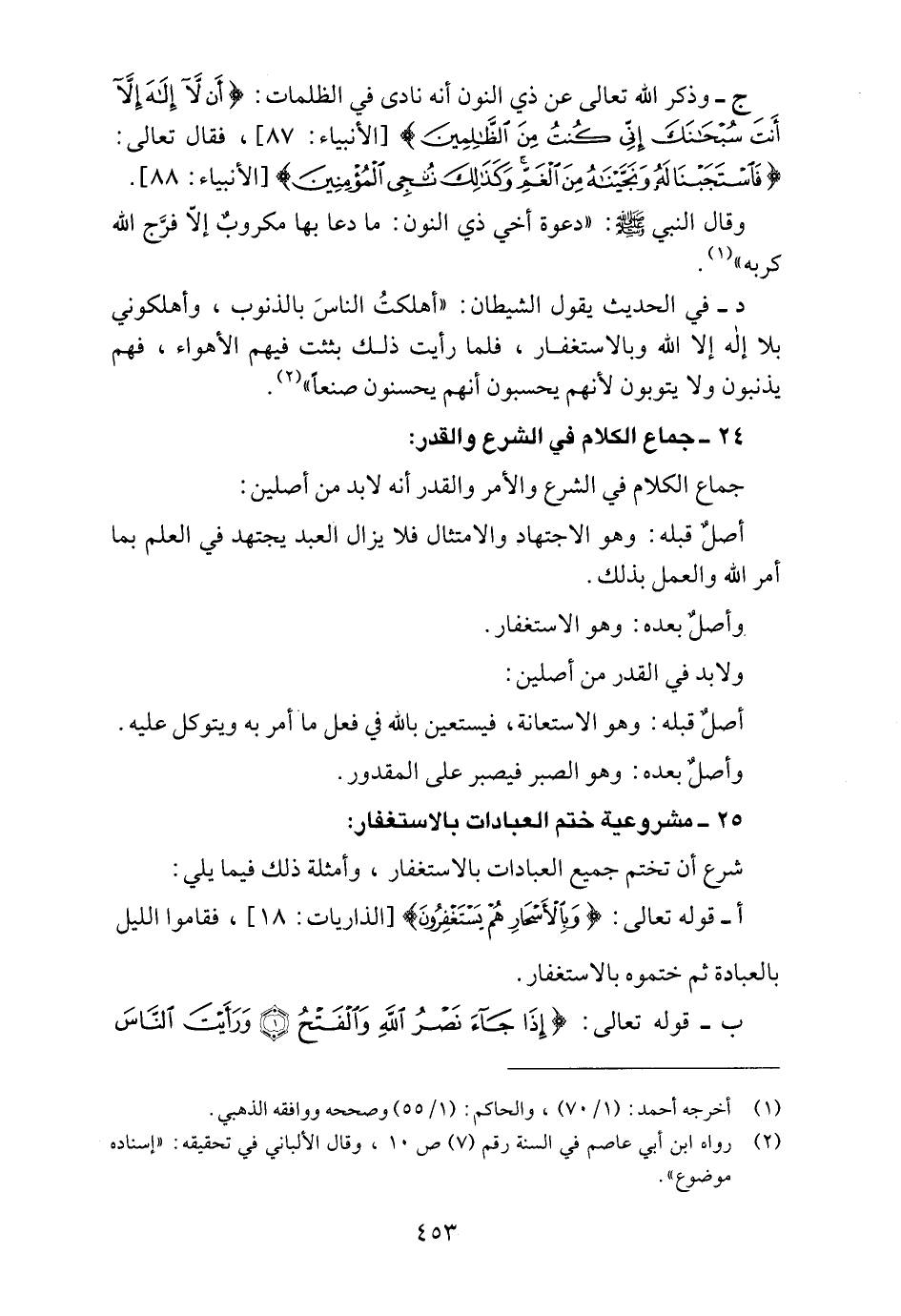 ج ـ وذكر الله تعالى عن ذي النون أنه نادى في الظلمات: {أنْ لا إِلَهَ إِلا أنْتَ سُبْحَانَكَ إِنِّي كُنْتُ مِنَ الظَّالِمِينَ} [الأنبياء 87] ، فقال تعالى: {فَاسْتَجَبْنَا لَهُ وَنَجَّيْنَاهُ مِنَ الْغَمِّ وَكَذَلِكَ نُنْجِي الْمُؤْمِنِينَ} [الأنبياء: 88] .