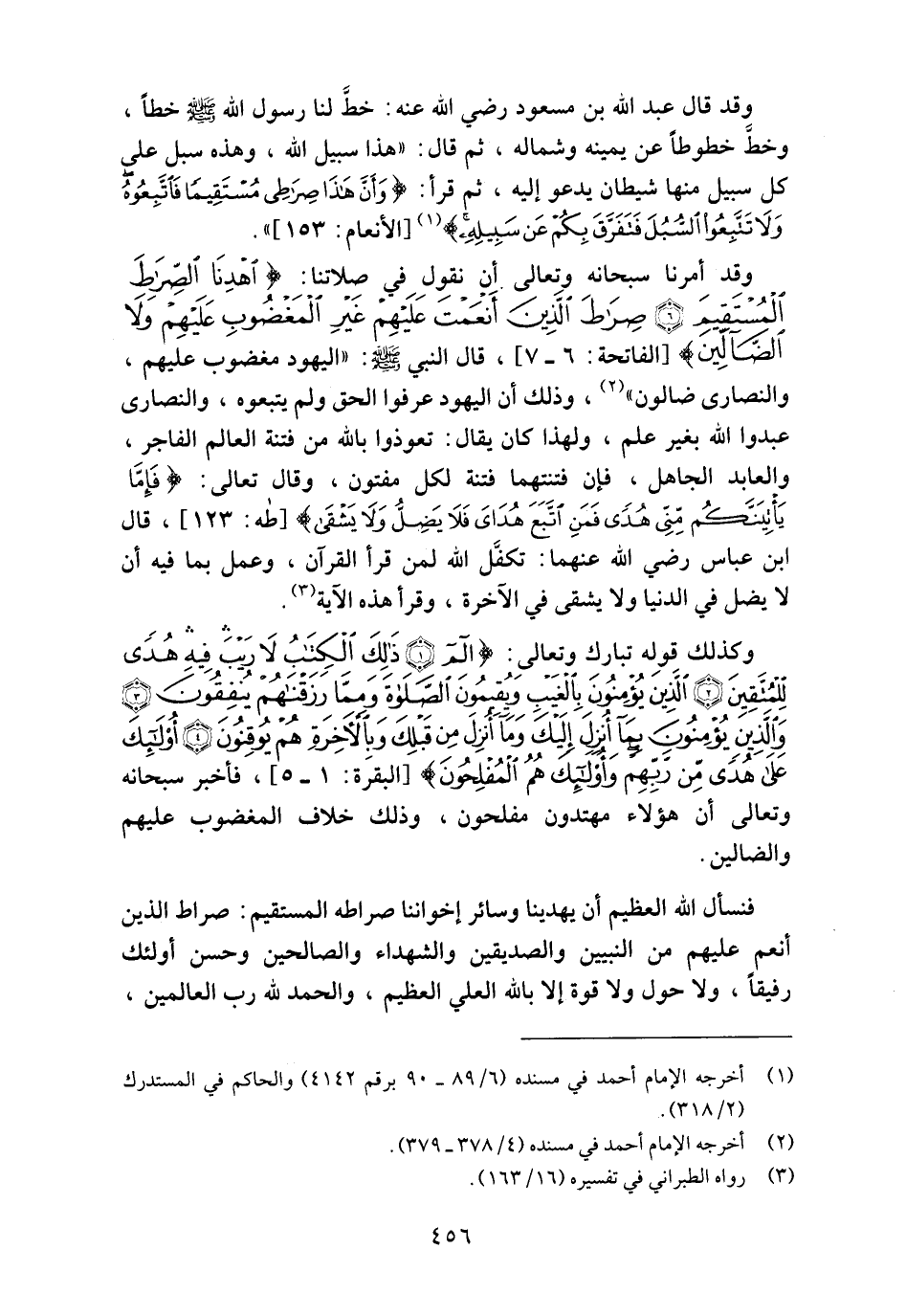 وقد أمرنا سبحانه وتعالى أن نقول في صلاتنا: {اهْدِنَا الصِّرَاطَ الْمُسْتَقِيمَ * صِرَاطَ الَّذِينَ أنْعَمْتَ عَلَيْهِمْ غَيْرِ الْمَغْضُوبِ عَلَيْهِمْ وَلا الضَّالِّينَ} [الفاتحة: 6 ـ 7] ، قال النبي صلى الله عليه وسلم: "اليهود مغضوب عليهم، والنصارى ضالون"، وذلك أن اليهود عرفوا الحق ولم يتبعوه، والنصارى عبدوا الله بغير علم، ولهذا كان يقال: تعوذوا بالله من فتنة العالم الفاجر، والعابد الجاهل، فإن فتنتهما فتنة لكل مفتون، وقال تعالى: {فَإِمَّا يَأْتِيَنَّكُمْ مِنِّي هُدًى فَمَنِ اتَّبَعَ هُدَايَ فَلا يَضِلُّ وَلا يَشْقَى} [طه: 123] ، قال ابن عباس رضي الله عنهما: تكفَّل الله لمن قرأ القرآن، وعمل بما فيه أن لا يضل في الدنيا ولا يشقى في الآخرة، وقرأ هذه الآية.