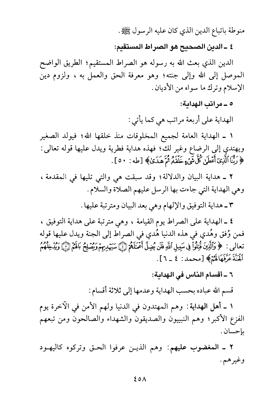 4 ـ الهداية على الصراط يوم القيامة، وهي مترتبة على هداية التوفيق، فمن وُفق وهُدي في الصراط إلى الجنة ويدل عليها قوله تعالى: {وَالَّذِينَ قُتِلُوا فِي سَبِيلِ اللَّهِ فَلَنْ يُضِلَّ أعْمَالَهُمْ * سَيَهْدِيهِمْ وَيُصْلِحُ بَالَهُمْ * وَيُدْخِلُهُمُ الْجَنَّةَ عَرَّفَهَا لَهُمْ} [محمد: 4 ـ 6] .