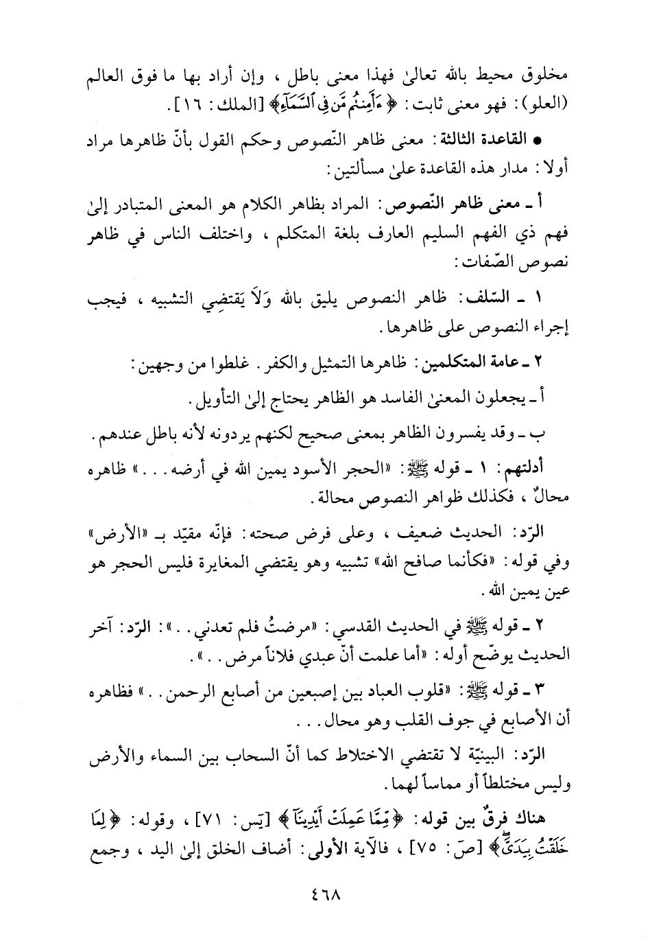 1 ـ السلف: ظاهر النصوص يليق بالله ولا يَقتضي التشبيه، فيجب إجراء النصوص على ظاهرها.
