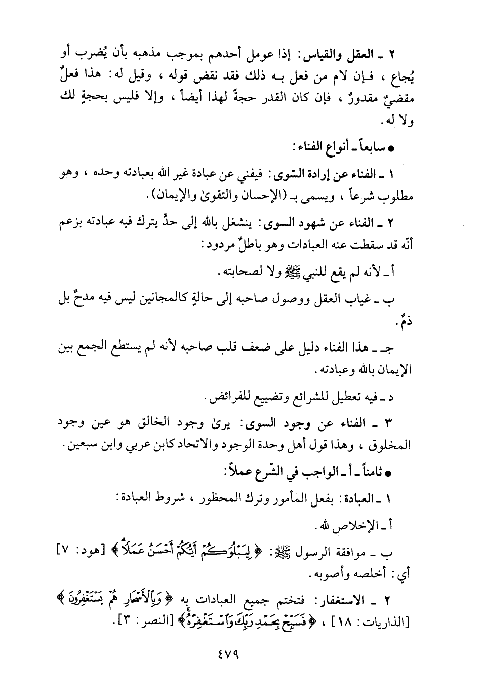 2 ـ الفناء عن شهود السوى: ينشغل بالله إلى حدٍّ يترك فيه عبادته بزعم أنّه قد سقطت عنه العبادات وهو باطلٌ مردود:
