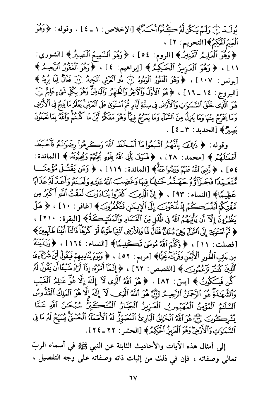 يُولَدْ*وَلَمْ يَكُنْ لَهُ كُفُواً أَحَدٌ} [الاخلاص: 1ـ4] ، وقوله: {وَهُوَ الْعَلِيمُ الْحَكِيمُ} [التحريم: 2] ، {وَهُوَ الْعَلِيمُ الْقَدِيرُ} [الروم: 54] ، {وَهُوَ السَّمِيعُ الْبَصِيرُ} [الشورى: 11] ، {وَهُوَ الْعَزِيزُ الْحَكِيم} [ابراهيم: 4] ، {وَهُوَ الْغَفُورُ الرَّحِيمُ} [يونس: 1.7] ، {وَهوالْغَفُورُ الْوَدُودُ*ذُو الْعَرْشِ الْمَجِيدُ*فعَّالٌ لِمَا يُرِيدُ} ، [البروج: 14ـ16] ، {هو الأول وَالْآخِرُ وَالظَّاهِرُ وَالْبَاطِنُ وَهُوَ بِكُلِّ شَيْءٍ عَلِيمٌ*هُوَ الَّذِي خَلَقَ السَّمَاوَاتِ وَالْأَرْضَ فِي سِتَّةِ أَيَّامٍ ثُمَّ اسْتَوَى عَلَى الْعَرْشِ يَعْلَمُ مَا يَلِجُ فِي الْأَرْضِ وَمَا يَخْرُجُ مِنْهَا وَمَا يَنْزِلُ مِنَ السَّمَاءِ وَمَا يَعْرُجُ فِيهَا وَهُوَ مَعَكُمْ أَيْنَ مَا كُنْتُمْ وَاللَّهُ بِمَا تَعْمَلُونَ بَصِيرٌ} [الحديد: 3ـ4] ، {ذَلِكَ بِأَنَّهُمُ اتَّبَعُوا مَا أَسْخَطَ اللَّهَ وَكَرِهُوا رِضْوَانَهُ فَأَحْبَطَ أَعْمَالَهُمْ} [محمد: 28] ، {فَسَوْفَ يَأْتِي اللَّهُ بِقَوْمٍ يُحِبُّهُمْ وَيُحِبُّونَهُ} [المائدة: 54] ، {رَضِيَ اللَّهُ عَنْهُمْ وَرَضُوا عَنْهُ} [المائدة: 119] ، {وَمَنْ يَقْتُلْ مُؤْمِناً مُتَعَمِّداً فَجَزَاؤُهُ جَهَنَّمُ خَالِداً فِيهَا وَغَضِبَ اللَّهُ عَلَيْهِ وَلَعَنَهُ وَأَعَدَّ لَهُ عَذَاباً عَظِيماً} [النساء: 93] ، {إِنَّ الَّذِينَ كَفَرُوا يُنَادَوْنَ لَمَقْتُ اللَّهِ أَكْبَرُ مِنْ مَقْتِكُمْ أَنْفُسَكُمْ إِذْ تُدْعَوْنَ إِلَى الْأِيمَانِ فَتَكْفُرُونَ} [غافر: 1.] ، {هَلْ يَنْظُرُونَ إِلَّا أَنْ يَأْتِيَهُمُ اللَّهُ فِي ظُلَلٍ مِنَ الْغَمَامِ وَالْمَلائِكَةُ وَقُضِيَ الْأَمْرُ وَإِلَى اللَّهِ تُرْجَعُ الْأُمُورُ} [البقرة: 21.] ، {ثُمَّ اسْتَوَى إِلَى السَّمَاءِ وَهِيَ دُخَانٌ فَقَالَ لَهَا وَلِلْأَرْضِ ائْتِيَا طَوْعاً أَوْ كَرْهاً قَالَتَا أَتَيْنَا طَائِعِينَ} [فصلت: 11] ، {وَكَلَّمَ اللَّهُ مُوسَى تَكْلِيماً} [النساء: 164] ، {وَنَادَيْنَاهُ مِنْ جَانِبِ الطُّورِ الْأَيْمَنِ وَقَرَّبْنَاهُ نَجِيّاً} [مريم: 52] ، {وَيَوْمَ يُنَادِيهِمْ فَيَقُولُ أَيْنَ شُرَكَائِيَ الَّذِينَ كُنْتُمْ تَزْعُمُونَ} [القصص: 62] ، {إِنَّمَا أَمْرُهُ إِذَا أَرَادَ شَيْئاً أَنْ يَقُولَ لَهُ كُنْ فَيَكُونُ} [يّس: 82] ، {هُوَ اللَّهُ الَّذِي لا إِلَهَ إِلَّا هُوَ عَالِمُ الْغَيْبِ وَالشَّهَادَةِ هُوَ الرَّحْمَنُ الرَّحِيمُ*هُوَ اللَّهُ الَّذِي لا إِلَهَ إِلَّا هُوَ الْمَلِكُ الْقُدُّوسُ السَّلامُ الْمُؤْمِنُ الْمُهَيْمِنُ الْعَزِيزُ الْجَبَّارُ الْمُتَكَبِّرُ سُبْحَانَ اللَّهِ عَمَّا يُشْرِكُونَ*هُوَ اللَّهُ الْخَالِقُ الْبَارِئُ الْمُصَوِّرُ لَهُ الْأَسْمَاءُ الْحُسْنَى يُسَبِّحُ لَهُ مَا فِي السَّمَاوَاتِ وَالْأَرْضِ وَهُوَ الْعَزِيزُ الْحَكِيمُ} [الحشر: 22ـ24] .