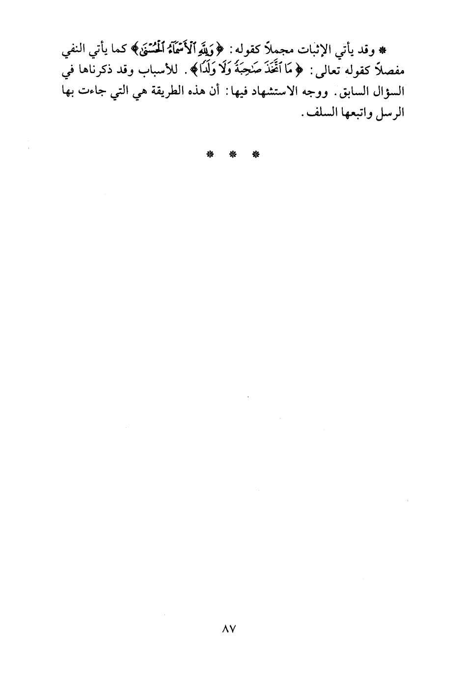 * وقد يأتي الإثبات مجملاً كقوله: {وَلِلَّهِ الْأَسْمَاءُ الْحُسْنَى} كما يأتي النفي مفصلاً كقوله تعالى: {مَا اتَّخَذَ صَاحِبَةً وَلا وَلَداً} . للأسباب وقد ذكرناها في السؤال السابق. ووجه الاستشهاد فيها: أن هذه الطريقة هي التي جاءت بها الرسل واتبعها السلف.