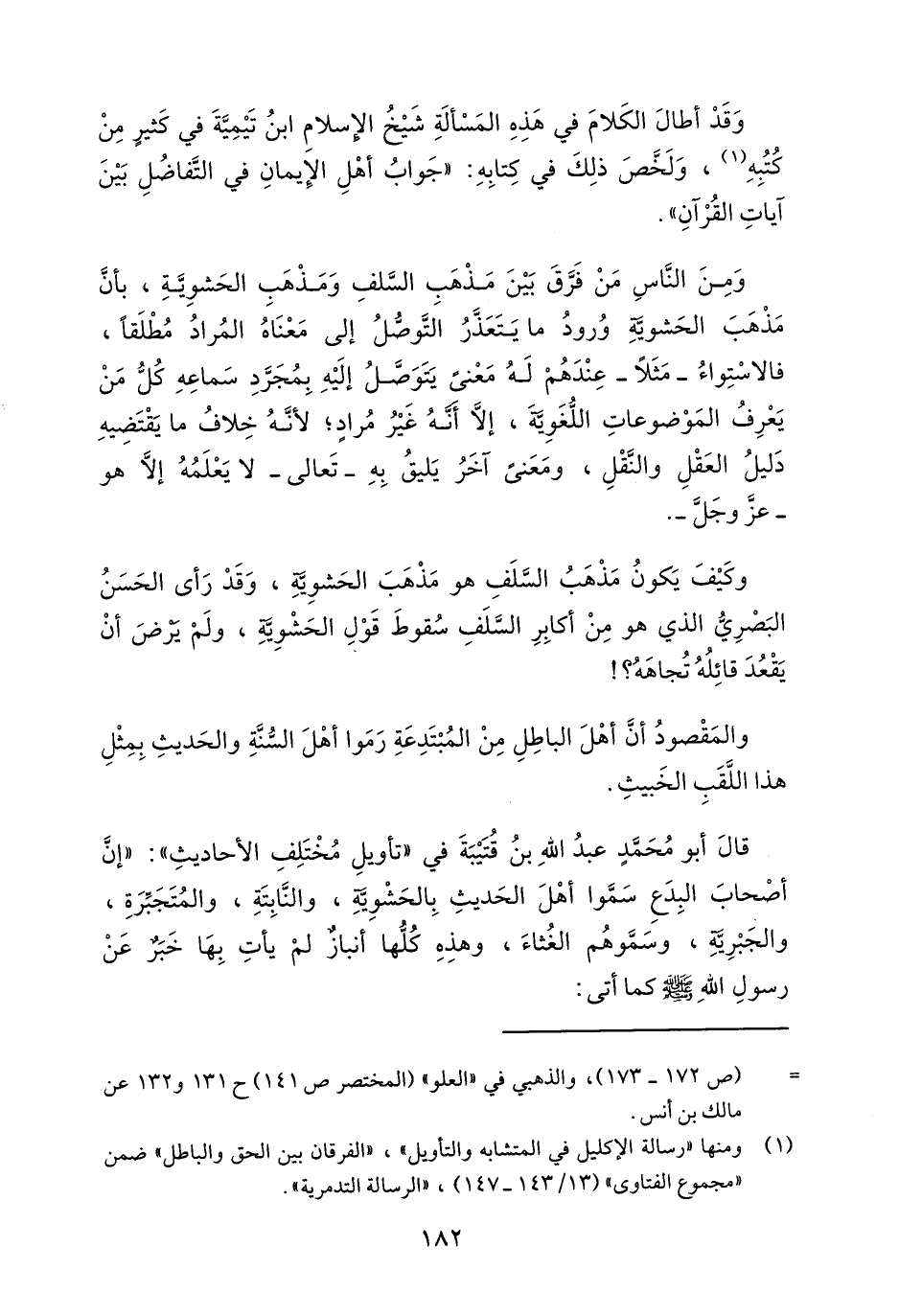 وكيف يكون مذهب السلف هو مذهب الحشوبة, وقد رأى الحسن البصري الذي هو من أكابر السلف سقوط قول الحشوية, ولم يرض لأن يقعد قائله تجاهه؟!.