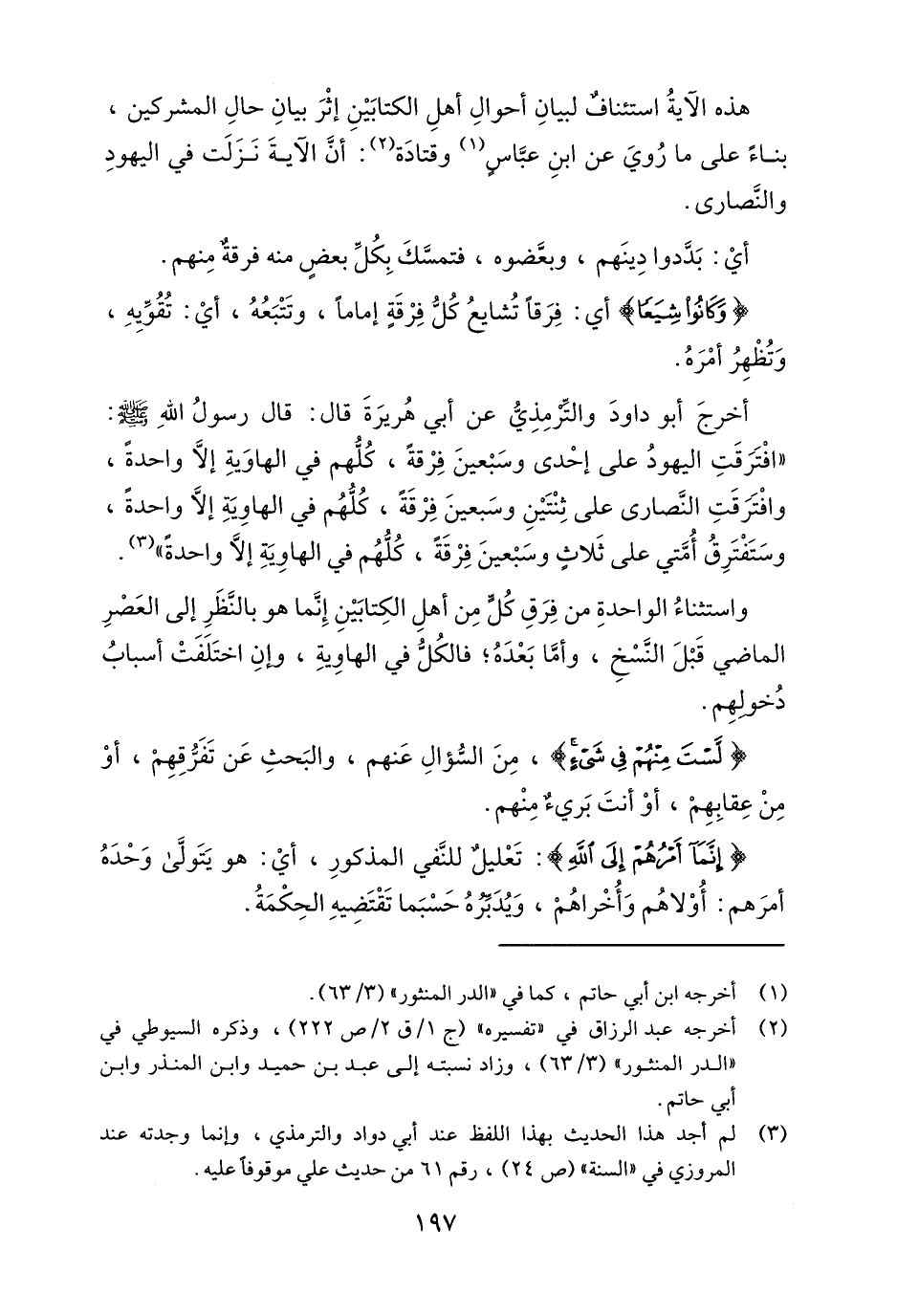 أخرج أبو داود والترمذي عن أبي هريرة قال: قال رسول الله صلى الله عليه وسلم: "افترقت اليهود على إحدى وسبعين فرقة, كلهم في الهاوية إلا واحدة, وافترقت النصارى على ثنتين وسبعين فرقة, كلهم في الهاوية إلا واحدة, وستفترق أمتي على ثلاث وسبعين فرقة كلهم في الهاوية إلا واحدة"3.