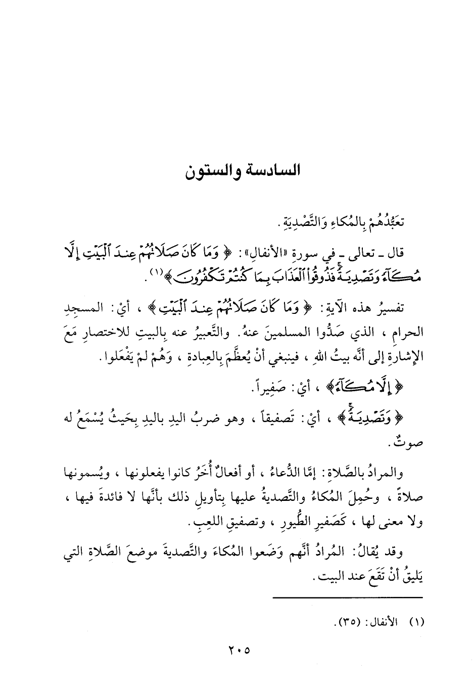 تفسير هذه الآية: {وَمَا كَانَ صَلاتُهُمْ عِنْدَ الْبَيْتِ} , أي: المسجد الحرام الذي صدوا الناس عنه, والتعبير عنه بالبيت للاختصار مع الإشارة إلى أنه بيت الله, وينبغي أن يعظم بالعبادة, وهم لم يفعلوا.