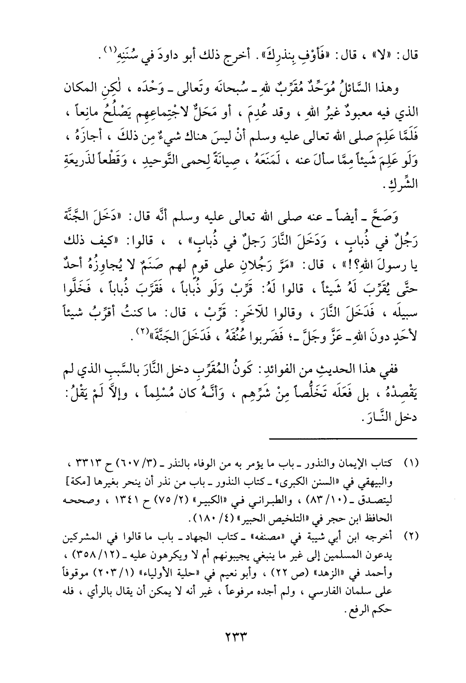 وصح أيضا عنه صلى الله عليه وسلم أنه قال: "دخل الجنة رجل في ذباب, ودخل النار رجل في ذباب", قالوا: "كيف ذلك يا رسول الله؟! , قال: مر رجلان على قوم لهم صنم لا يجاوزه أحد حتى يقرب له شيئا, قالوا له: قرب ولو ذبابا, فقرب ذبابا, فخلوا سبيله, فدخل النار, وقالوا للآخر قرب, قال: ما كنت أقرب شيئا لأحد دون الله عز وجل, فضربوا عنقه, فدخل الجنة"2.