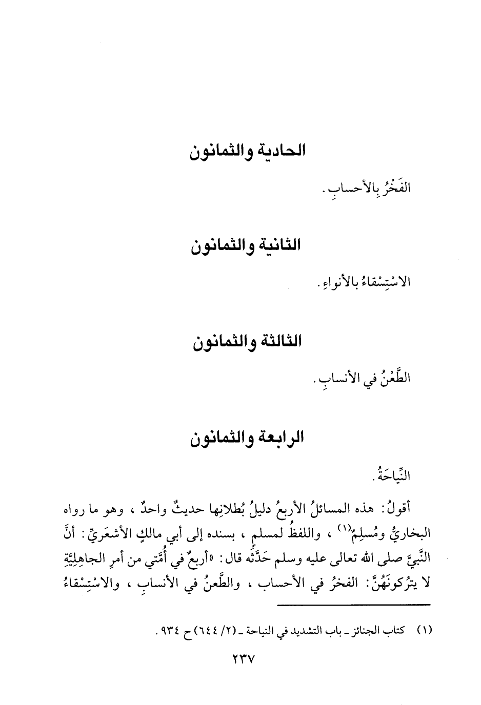 أقول: هذه المسائل الأربع دليل بطلانها حديث واحد, وهو ما رواه البخاري ومسلم1, بسنده إلى أبي مالك الأشعري: أن النبي صلى الله عليه وسلم حدثه قال: "أربع في أمتي من أمر الجاهلية لا يتركونهن: الفخر في الأحساب, والطعن في الأنساب, والاستسقاء