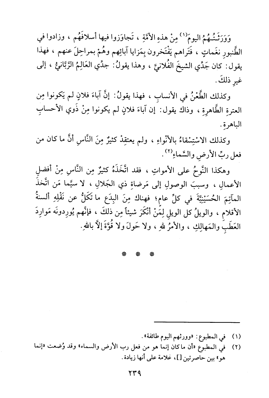 وهكذا النوح على الأموات, فقد اتخذه كثير من الناس من أفضل الأعمال, وسبب الوصول إلى مرضاة ذي الجلال, لا سيما من اتخذ المآتم الحسينية في كل عام, فهناك من البدع ما تكل عن نقله ألسنة الأقلام, والويل كل الويل, لمن أنكر شيئا من ذلك, فإنهم يوردونهم موارد العطب والمهالك, والأمر لله, ولا حول ولا قوة إلا بالله.