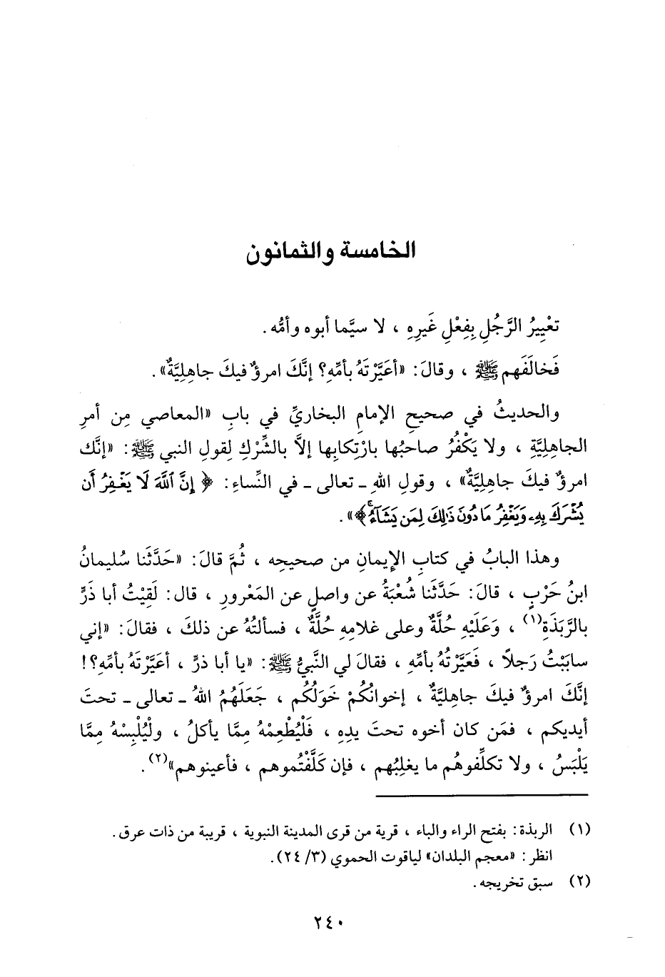 وهذا الباب في كتاب الإيمان من صحيحه, ثم قال: "حدثنا سليمان ابن حرب, قال: حدثنا شعبة عن واصل عن معرور, قال: لقيت أبا ذر بالربذة1, وعليه حلة وعلى غلامه حلة, فسألته عن ذلك, فقال إني ساببت رجلا, فعيرته بأمه, فقال لي النبي صلى الله عليه وسلم: "يا أبا ذر أعيرته بأمه؟! , إنك امرؤ فيك جاهلية, إخوانكم خولكم, جعلهم الله تعالى تحت أيديكم, فمن كان أخوه تحت يده, فليطعمه مما يأكل, وليلبسه مما يلبس, ولا تكلفوهم ما يغلبهم, فإن كلفتموهم فأعينوهم"2.