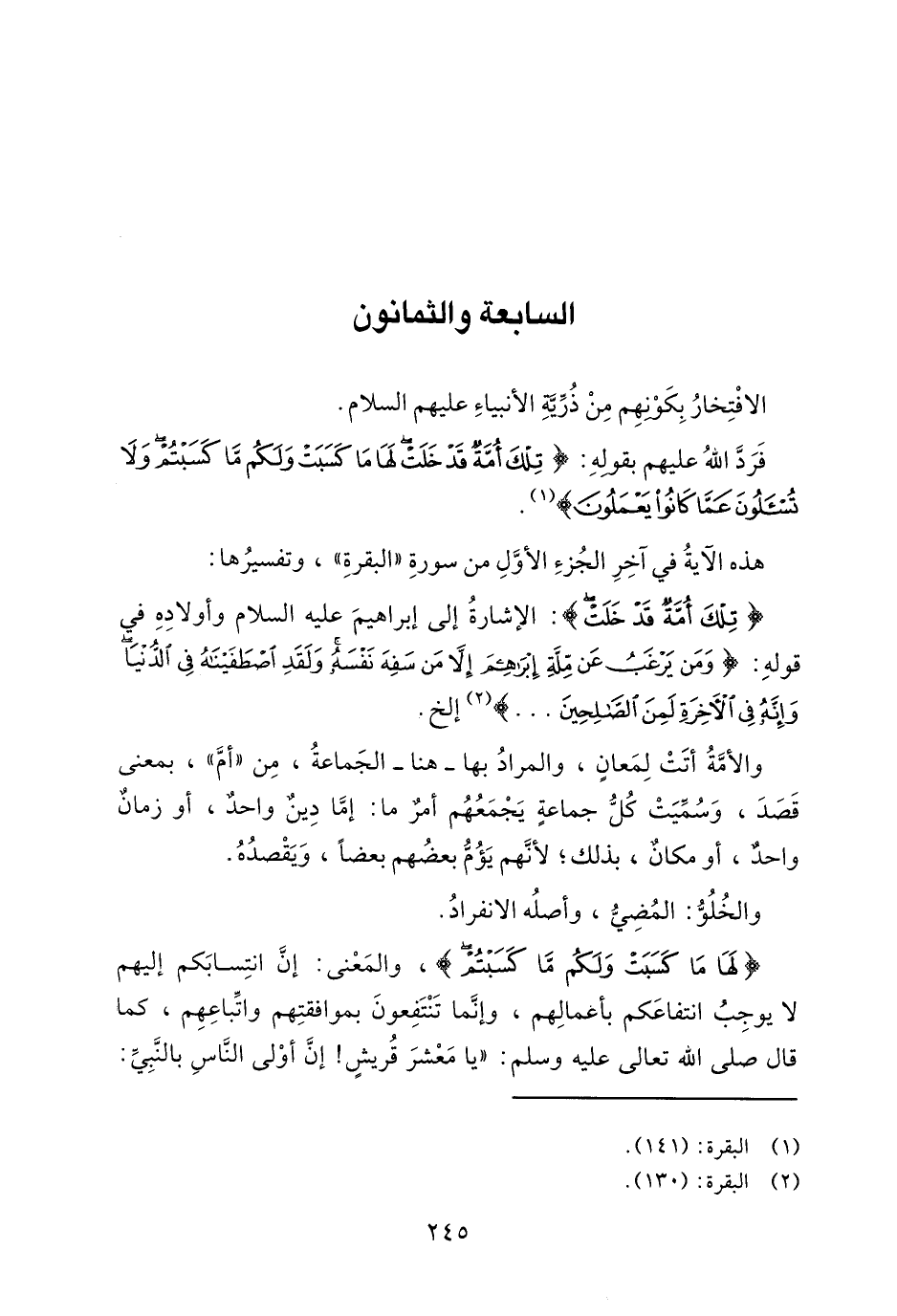 {تِلْكَ أُمَّةٌ قَدْ خَلَتْ} : الإشارة إلى إبراهيم عليه السلام وأولاده في قوله: {وَمَنْ يَرْغَبُ عَنْ مِلَّةِ إِبْرَاهِيمَ إِلَّا مَنْ سَفِهَ نَفْسَهُ وَلَقَدِ اصْطَفَيْنَاهُ فِي الدُّنْيَا وَإِنَّهُ فِي الْآخِرَةِ لَمِنَ الصَّالِحِينَ ... } 2 إلخ.