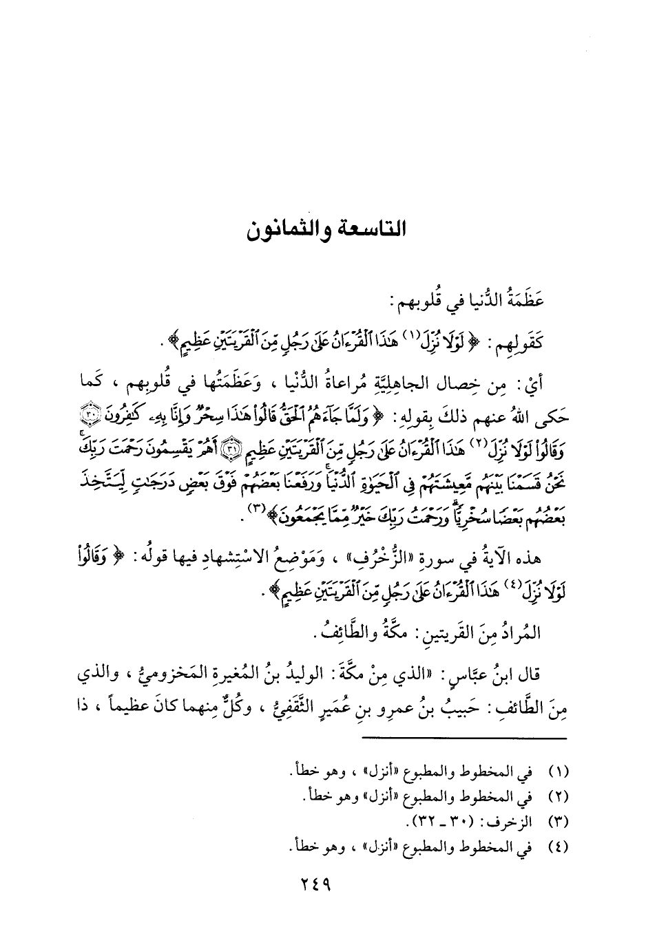 هذه الىية من سورة الزخرف, وموضع الاستشهاد فيها قوله: {وَقَالُوا لَوْلَا نُزِّلَ4 هَذَا الْقُرْآنُ عَلَى رَجُلٍ مِّنَ الْقَرْيَتَيْنِ عَظِيمٍ} .