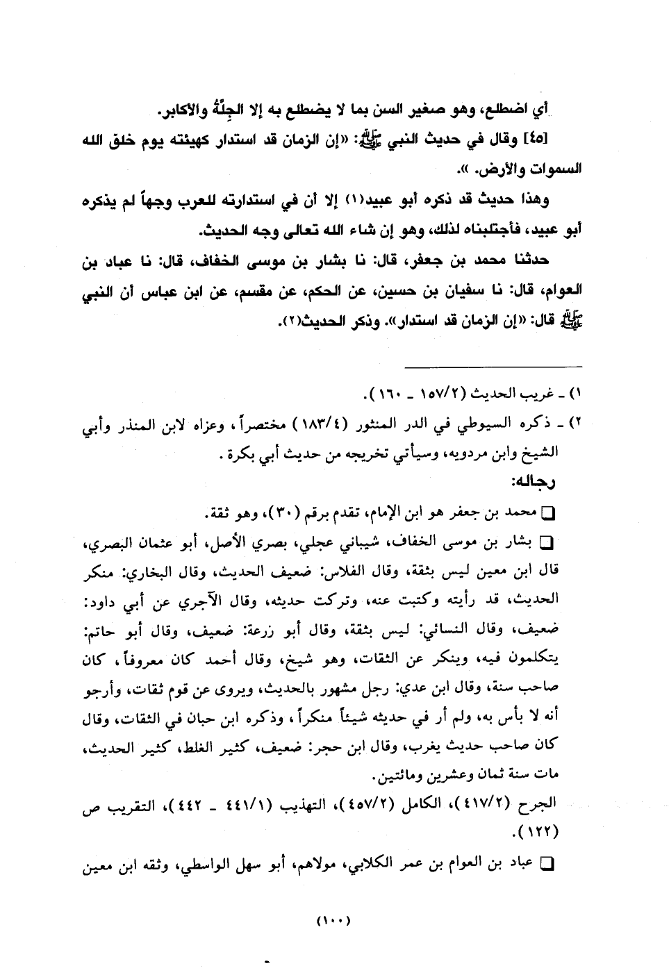 حَدَّثَنَا مُحَمَّدُ بْنُ جَعْفَرٍ، قَالَ: نا بَشَّارُ بْنُ مُوسَى الْخَفَّافُ، قَالَ: نا عَبَّادُ بْنُ الْعَوَّامِ، قَالَ: نا سُفْيَانُ بْنُ حُسَيْنٍ، عَنِ الْحَكَمِ، عَنْ مِقْسَمٍ، عَنِ ابْنِ عَبَّاسٍ، أَنَّ النَّبيَّ صَلَّى اللَّهُ عَلَيْهِ وَسَلَّمَ، قَالَ: «إِنَّ §الزَّمَانَ قَدِ اسْتَدَارَ» وَذَكَرَ الْحَدِيثَ