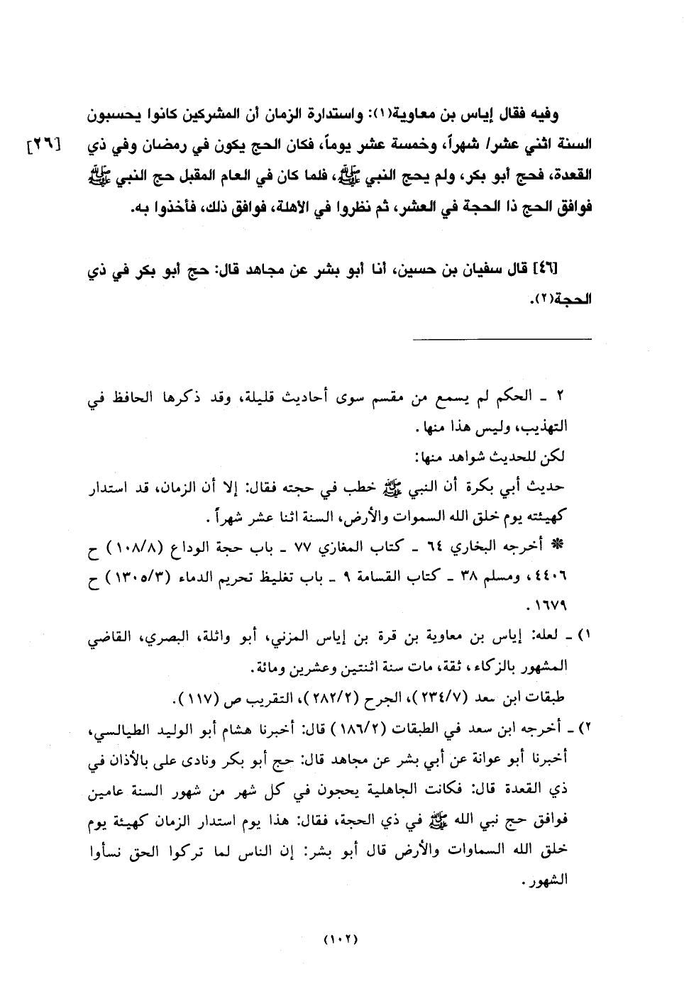 وَفِيهِ فَقَالَ إِيَاسُ بْنُ مُعَاوِيَةَ: وَاسْتِدَارَةُ الزَّمَانِ أَنَّ الْمُشْرِكِينَ كَانُوا يَحْسِبُونَ السَّنَةَ اثْنَيْ عَشَرَ شَهْرًا، وَخَمْسَةَ عَشَرَ يَوْمًا، فَكَانَ الْحَجُّ يَكُونُ فِي رَمَضَانَ وَفِي ذِي الْقَعْدَةِ، فَحَجَّ أَبُو بَكْرٍ، وَلَمْ يَحُجَّ النَّبيُّ صَلَّى اللَّهُ عَلَيْهِ وَسَلَّمَ، فَلَمَّا كَانَ فِي الْعَامِ الْمُقْبِلِ حَجَّ النَّبيُّ صَلَّى اللَّهُ عَلَيْهِ وَسَلَّمَ فَوَافَقَ الْحَجُّ ذَا الْحِجَّةِ فِي الْعَشْرِ، ثُمَّ نَظَرُوا فِي الْأَهِلَّةِ، فَوَافَقَ ذَلِكَ، فَأَخَذُوا بِهِ
