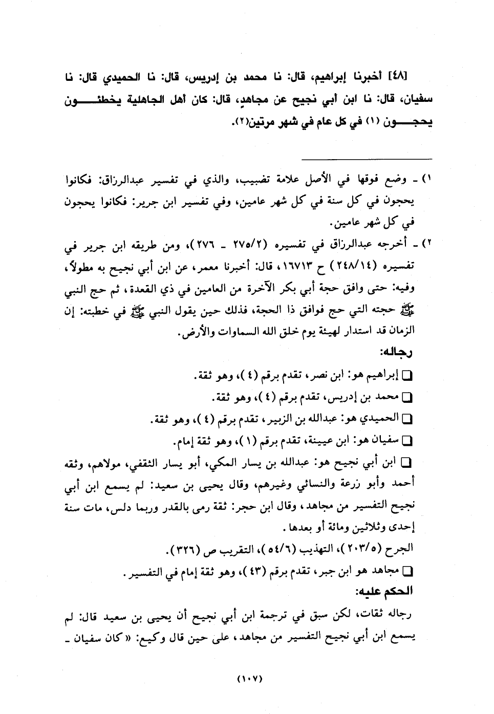 48 - أَخْبَرَنَا إِبْرَاهِيمُ، قَالَ: نا مُحَمَّدُ بْنُ إِدْرِيسَ، قَالَ: نا الْحُمَيْدِيُّ، قَالَ: نا سُفْيَانُ، قَالَ: نا ابْنُ أَبِي نَجِيحٍ، عَنْ مُجَاهِدٍ، قَالَ: §كَانَ أَهْلُ الْجَاهِلِيَّةِ يُخْطِئُونَ يَحُجُّونَ فِي كُلِّ عَامٍ فِي شَهْرٍ مَرَّتَيْنِ