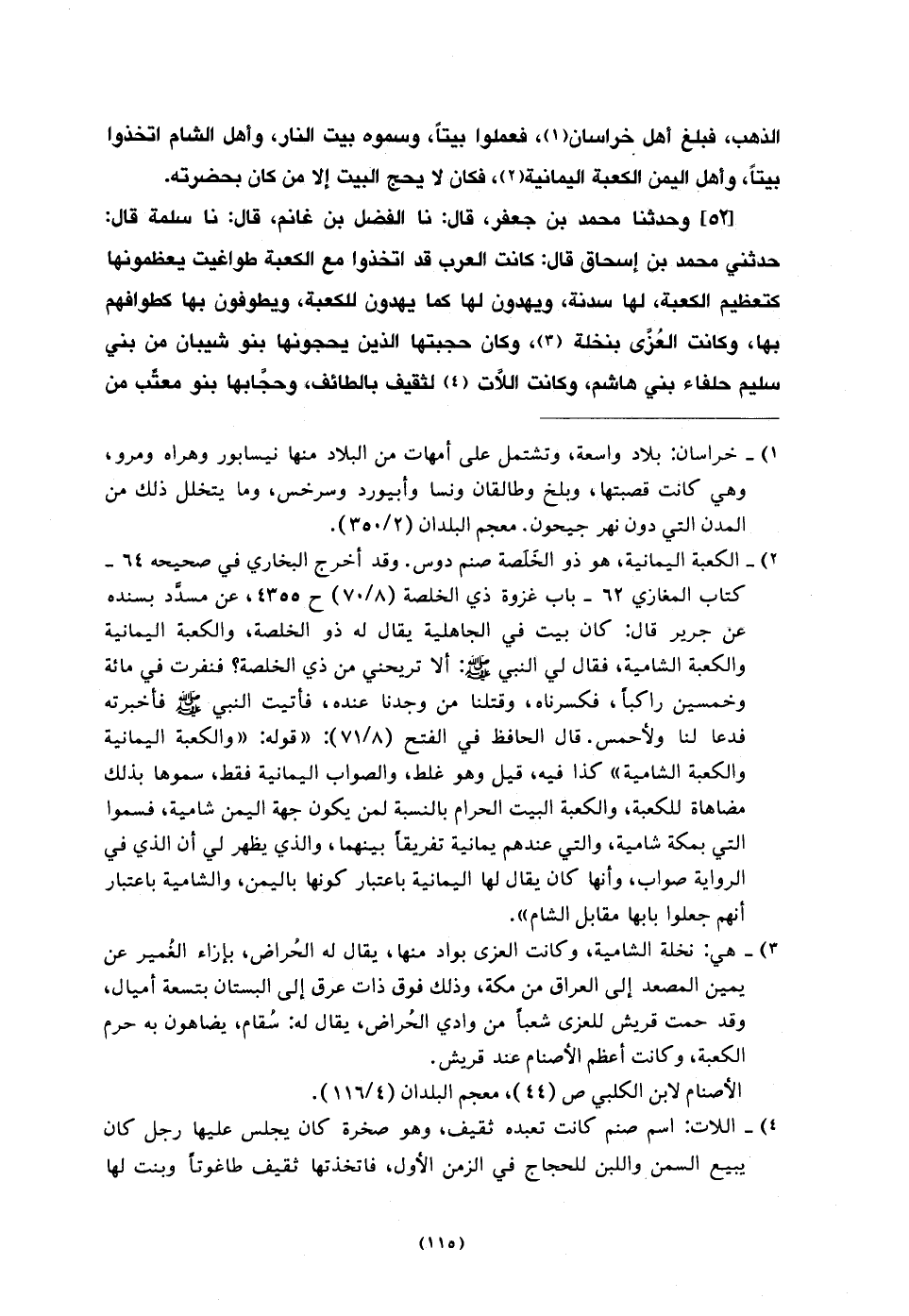 52 - وَحَدَّثْنَا مُحَمَّدُ بْنُ جَعْفَرٍ، قَالَ: نا الْفَضْلُ بْنُ غَانِمٍ، قَالَ: نا سَلَمَةُ، قَالَ: حَدَّثَنِي مُحَمَّدُ بْنُ إِسْحَاقَ، قَالَ: §كَانَتِ الْعَرَبُ قَدِ اتَّخَذُوا مَعَ الْكَعْبَةِ طَوَاغِيتَ يُعَظِّمُونَهَا كَتَعْظِيمِ الْكَعْبَةِ، لَهَا سَدَنَةٌ، وَيَهْدُونَ لَهَا كَمَا يَهْدُونَ لِلْكَعْبَةِ، وَيَطُوفُونَ بِهَا كَطَوَافِهِمْ بِهَا، وَكَانَتِ الْعُزَّى بِنَخْلَةَ، وَكَانَ حَجَبَتُهَا الَّذِينَ يَحُجُّونَهَا بَنُو شَيْبَانَ مِنْ بَنِي سُلَيْمٍ حُلَفَاءُ بَنِي هَاشِمٍ، وَكَانَتِ اللَّاتُ لِثَقِيفَ بِالطَّائِفِ، وَحُجَّابُهَا بَنُو مُعَتِّبٍ مِنْ