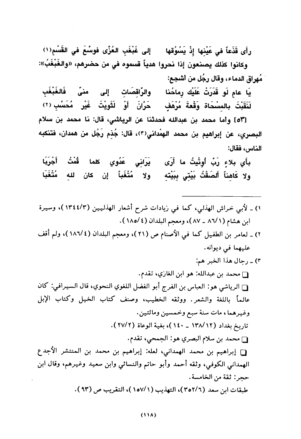 53 - وَأَمَّا مُحَمَّدُ بْنُ عَبْدِ اللَّهِ فَحَدَّثَنَا، عَنِ الرِّيَاشِيِّ، قَالَ: نا مُحَمَّدُ بْنُ سَلَامٍ الْبَصْرِيُّ، عَنْ إِبْرَاهِيمَ بْنِ مُحَمَّدٍ الْهَمْدَانِيِّ، قَالَ: جُذِمَ رَجُلٌ مِنْ هَمْدَانَ، فَتَنَكَّبَهُ النَّاسُ، فَقَالَ: §بِأَيِّ بَلَاءٍ رَبِّ أُوِتْيتُ مَا أَرَى ... يَرَانِي عَدُوِّي كُلَّمَا قُمْتُ أَجْرَبَا