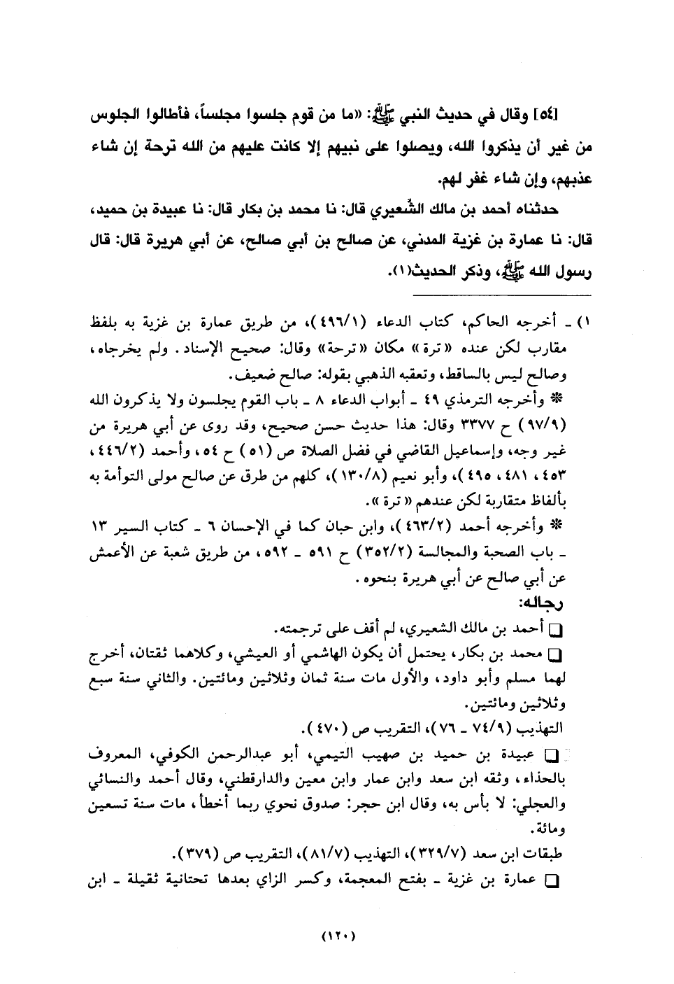 54 - وَقَالَ فِي حَدِيثِ النَّبيِّ صَلَّى اللَّهُ عَلَيْهِ وَسَلَّمَ: «§مَا مِنْ قَوْمٍ جَلَسُوا مَجْلِسًا، فَأَطَالُوا الْجُلُوسَ مِنْ غَيْرِ أَنْ يَذْكُرُوا اللَّهَ، وَيُصَلُّوا عَلَى نَبِيِّهِمْ إِلَّا كَانَتْ عَلَيْهِمْ مِنَ اللَّهِ تَرْحَةٌ إِنْ شَاءَ عَذَّبَهُمْ وَإِنْ شَاءَ غَفَرَ لَهُمْ» .