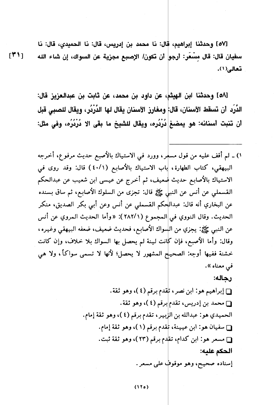57 - وَحَدَّثَنَا إِبْرَاهِيمُ، قَالَ: نا مُحَمَّدُ بْنُ إِدْرِيسَ، قَالَ: نا الْحُمَيْدِيُّ، قَالَ: نا سُفْيَانُ، قَالَ: قَالَ مِسْعَرٌ: §أَرْجُو أَنْ تَكُونَ الْإِصْبَعُ مُجْزِيَةً عَنِ السِّوَاكِ، إِنْ شَاءَ اللَّهُ تَعَالَى