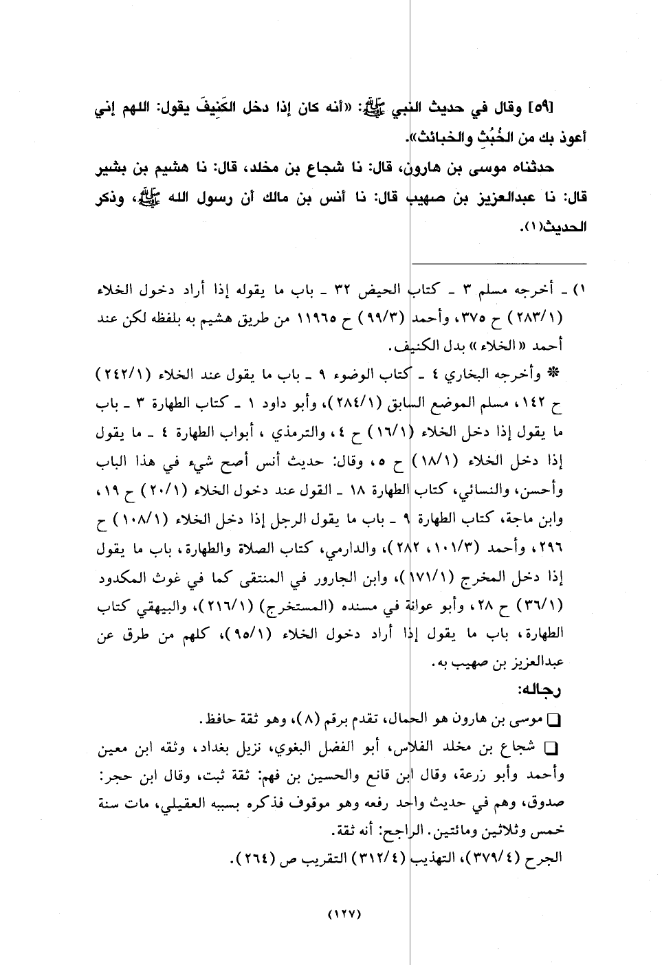 59 - وَقَالَ فِي حَدِيثِ النَّبيِّ صَلَّى اللَّهُ عَلَيْهِ وَسَلَّمَ: " أَنَّهُ كَانَ §إِذَا دَخَلَ الْكَنِيفَ، يَقُولُ: اللَّهُمَّ إِنِّي أَعُوذُ بِكَ مِنَ الْخُبُثِ وَالْخَبَائِثِ ".