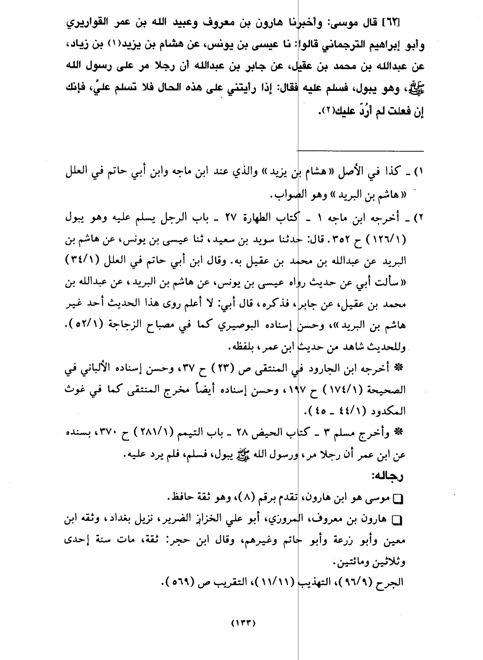 62 - قَالَ مُوسَى وَأَخْبَرَنَا هَارُونُ بْنُ مَعْرُوفٍ، وَعُبَيْدُ اللَّهِ بْنُ عُمَرَ الْقَوَارِيرِيُّ، وَأَبُو إِبْرَاهِيمَ التُّرْجُمَانِيُّ، قَالُوا: نا عِيسَى بْنُ يُونُسَ، عَنْ هِشَامِ بْنِ يَزِيدَ بْنِ زِيَادٍ، عَنْ عَبْدِ اللَّهِ بْنِ مُحَمَّدِ بْنِ عَقِيلٍ، عَنْ جَابِرِ بْنِ عَبْدِ اللَّهِ، أَنَّ رَجُلًا §مَرَّ عَلَى رَسُولِ اللَّهِ صَلَّى اللَّهُ عَلَيْهِ وَسَلَّمَ وَهُوَ يَبُولُ، فَسَلَّمَ عَلَيْهِ، فَقَالَ: «إِذَا رَأَيْتَنِي عَلَى هَذِهِ الْحَالِ فَلَا تُسَلِّمْ عَلَيَّ، فَإِنَّكَ إِنْ فَعَلْتَ لَمْ أَرُدَّ عَلَيْكَ»