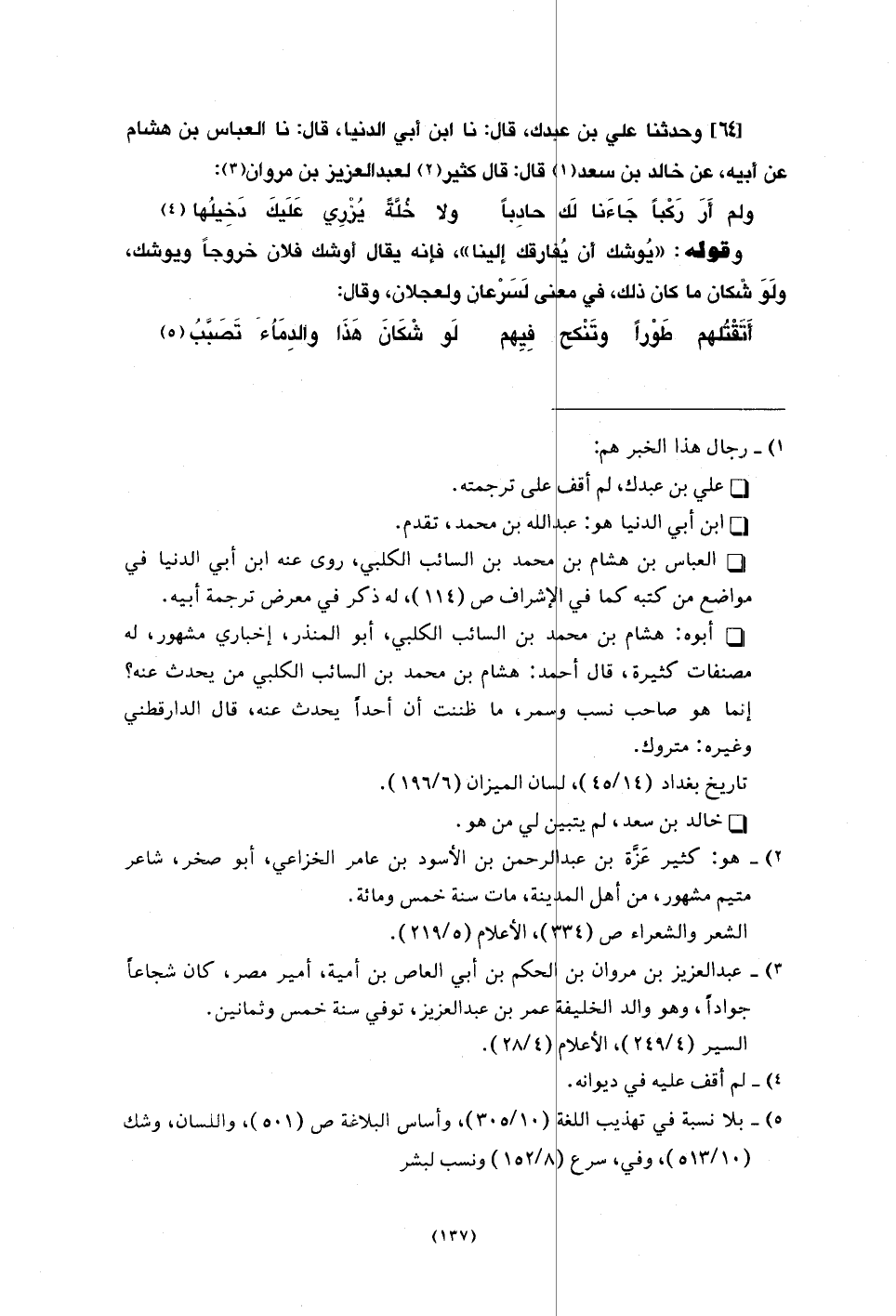 وَحَدَّثَنَا عَلِيُّ بْنُ عَبْدَكَ، قَالَ: نا ابْنُ أَبِي الدُّنْيَا، قَالَ: نا الْعَبَّاسُ بْنُ هِشَامٍ، عَنْ أَبِيهِ، عَنْ خَالِدِ بْنِ سَعْدٍ، قَالَ: قَالَ كَثِيرٌ لِعَبْدِ الْعَزِيزِ بْنِ مَرْوَانَ: