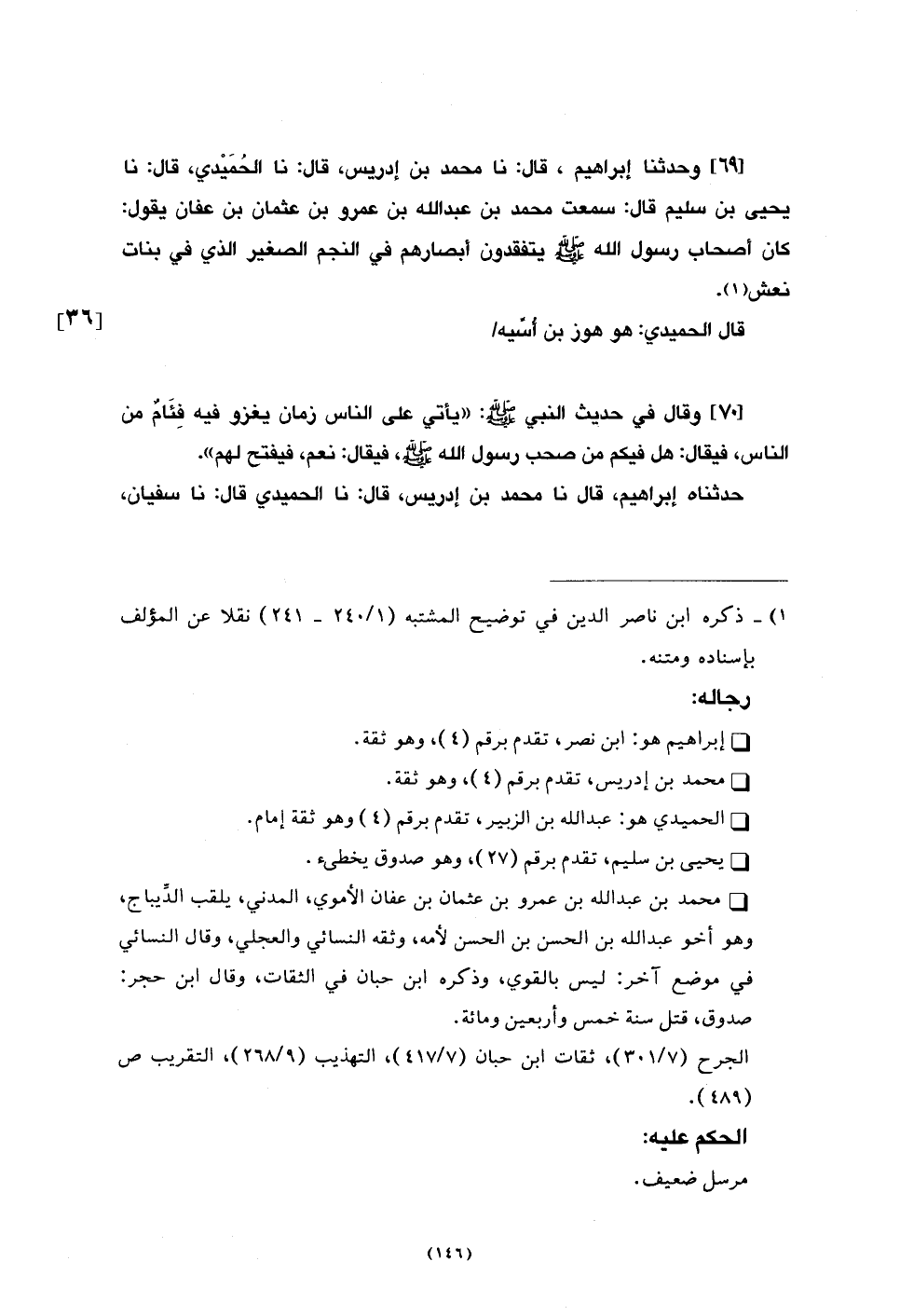 69 - وَحَدَّثَنَا إِبْرَاهِيمُ، قَالَ: نا مُحَمَّدُ بْنُ إِدْرِيسَ، قَالَ: نا الْحُمَيْدِيُّ، قَالَ: نا يَحْيَى بْنُ سُلَيْمٍ، قَالَ: سَمِعْتُ مُحَمَّدَ بْنَ عَبْدِ اللَّهِ بْنِ عَمْرِو بْنِ عُثْمَانَ بْنِ عَفَّانَ، يَقُولُ: كَانَ أَصْحَابُ رَسُولِ اللَّهِ صَلَّى اللَّهُ عَلَيْهِ وَسَلَّمَ §يَتَفَقَّدُونَ أَبْصَارَهُمْ فِي النَّجْمِ الصَّغِيرِ الَّذِي فِي بَنَاتِ نَعْشٍ