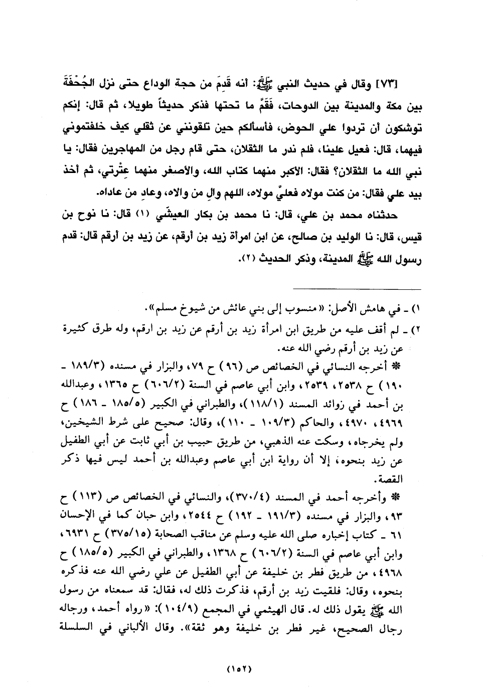 73 - وَقَالَ فِي حَدِيثِ النَّبيِّ صَلَّى اللَّهُ عَلَيْهِ وَسَلَّمَ: أَنَّهُ قَدِمَ مِنْ حَجَّةِ الْوَدَاعِ حَتَّى نَزَلَ الْجُحْفَةَ بَيْنَ مَكَّةَ وَالْمَدِينَةِ بَيْنَ الدَّوْحَاتِ، فَقَمَّ مَا تَحْتَهَا فَذَكَرَ حَدِيثًا طَوِيلًا، ثُمَّ قَالَ: إِنَّكُمْ §تُوشِكُونَ أَنْ تَرِدُوا عَلَى الْحَوْضِ، فَأَسْأَلُكُمْ حِينَ تَلْقَوْنَنِي عَنْ ثَقَلَيَّ كَيْفَ خَلَفْتُمُونِي فِيهِمَا، قَالَ: فَعِيلَ عَلَيْنَا، فَلَمْ نَدْرِ مَا الثَّقَلَانِ، حَتَّى قَامَ رَجُلٌ مِنَ الْمُهَاجِرِينَ، فَقَالَ: يَا نَبِيَّ اللَّهِ مَا الثَّقَلَانِ؟ فَقَالَ: الْأَكْبَرُ مِنْهُمَا كِتَابُ اللَّهِ، وَالْأَصْغَرُ مِنْهُمَا عِتْرَتِي، ثُمَّ أَخَذَ بِيَدِ عَلِيٍّ، فَقَالَ: «مَنْ كُنْتُ مَوْلَاهُ فَعَلِيٌّ مَوْلَاهُ، اللَّهُمَّ وَالِ مَنْ وَالَاهُ، وَعَادِ مَنْ عَادَاهُ» .