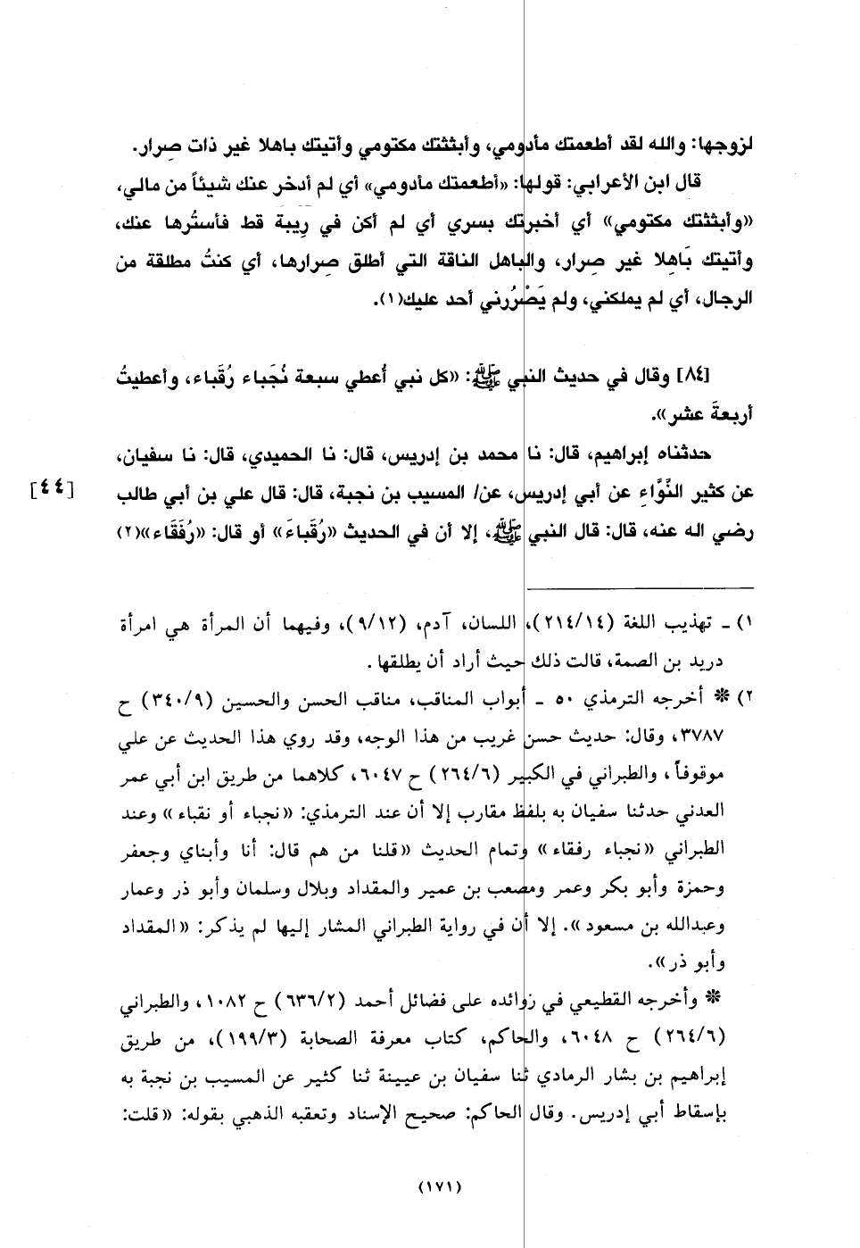 84 - وَقَالَ فِي حَدِيثِ النَّبيِّ صَلَّى اللَّهُ عَلَيْهِ وَسَلَّمَ: «§كُلُّ نَبِيٍّ أُعِطِيَ سَبْعَةَ نُجَبَاءَ رُقَبَاءَ، وَأُعْطِيتُ أَرْبَعَةَ عَشَرَ» .