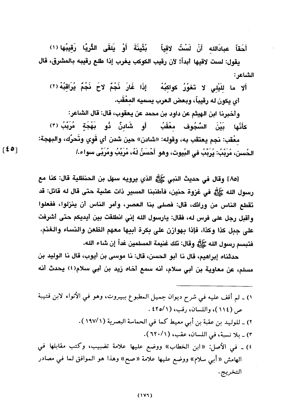85 - وَقَالَ فِي حَدِيثِ النَّبيِّ صَلَّى اللَّهُ عَلَيْهِ وَسَلَّمَ الَّذِي يَرْوِيهِ سَهْلُ بْنُ الْحَنْظَلِيَّةِ، قَالَ: §كُنَّا مَعَ رَسُولِ اللَّهِ صَلَّى اللَّهُ عَلَيْهِ وَسَلَّمَ فِي غَزْوَةِ حُنَيْنٍ، فَأَطْنَبْنَا الْمَسِيرَ ذَاتَ عَشِيَّةٍ، حَتَّى قَالَ لَهُ قَائِلٌ: قَدْ تَقَطَّعَ النَّاسُ مِنْ وَرَائِكَ، قَالَ: فَصَلَّى بِنَا الْعَصْرَ، وَأَمَرَ النَّاسَ أَنْ يَنْزِلُوا، فَفَعَلُوا وَأَقْبَلَ رَجُلٌ عَلَى فَرَسٍ لَهُ، فَقَالَ: يَا رَسُولَ اللَّهِ، إِنِّي انْطَلَقْتُ بَيْنَ أَيْدِيكُمْ حَتَّى أَشْرَفْتُ عَلَى جَبَلِ كَذَا وَكَذَا، فَإِذَا بِهَوَازِنَ عَلَى بَكْرَةِ أَبِيهَا مَعَهُمُ الظَّعْنُ وَالنِّسَاءُ وَالْغَنَمُ، فَتَبَسَّمَ رَسُولُ اللَّهِ صَلَّى اللَّهُ عَلَيْهِ وَسَلَّمَ وَقَالَ: «تِلْكَ غَنِيمَةُ الْمُسْلِمِينَ غَدًا إِنْ شَاءَ اللَّهُ» .