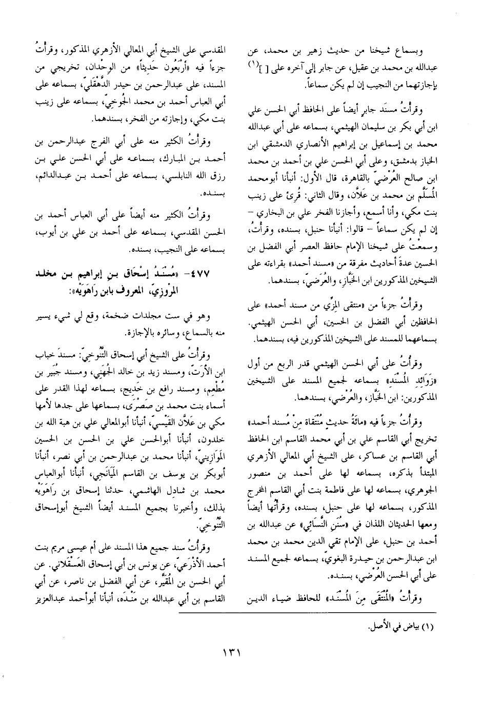 وقرأت مُسْند جَابر أَيْضا على الْحَافِظ أبي الْحسن عَليّ ابْن أبي بكر بن سُلَيْمَان الهيثمي بِسَمَاعِهِ على أبي عبد الله مُحَمَّد بن إِسْمَاعِيل بن إِبْرَاهِيم الْأنْصَارِيّ الدِّمَشْقِي ابْن الخباز بِدِمَشْق وعَلى أبي الْحسن عَليّ بن أَحْمد بن مُحَمَّد بن صَالح العرضي بِالْقَاهِرَةِ قَالَ الأول أَنبأَنَا أَبُو مُحَمَّد الْمُسلم بن مُحَمَّد بن عَلان وَقَالَ الثَّانِي قرئَ على زَيْنَب بنت مكي وَأَنا أسمع وأجازنا الْفَخر عَليّ بن البُخَارِيّ إِن لم يكن سَمَاعا قَالُوا أَنبأَنَا حَنْبَل بِسَنَدِهِ وقرأت وَسمعت على شَيخنَا الإِمَام حَافظ الْعَصْر أبي الْفضل بن الْحُسَيْن عدَّة أَحَادِيث مفرقة من مُسْند أَحْمد بقرَاءَته على الشَّيْخَيْنِ الْمَذْكُورين بن الخباز والعرضي بسندهما