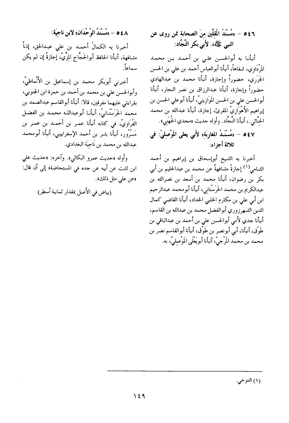 أَنبأَنَا بِهِ أَبُو الْحسن عَليّ بن أَحْمد بن مُحَمَّد المرداوي شفاها أَنبأَنَا أَبُو الْعَبَّاس أَحْمد بن عَليّ بن الْحسن الْجَزرِي حضورا وإجازة أَنبأَنَا مُحَمَّد بن عبد الْهَادِي حضورا وإجازة أنبانا عبد الرَّزَّاق بن نصر النجار أنبانا أَبُو الْحسن عَليّ بن الْحسن الموازيني أَنبأَنَا أَبُو عَليّ الْحسن بن إِبْرَاهِيم الْأَهْوَازِي الْمُقْرِئ إجَازَة أنبانا عبد الله بن مُحَمَّد الحنائي أَنبأَنَا النجاد وأوله حَدِيث مجدي الْجُهَنِيّ